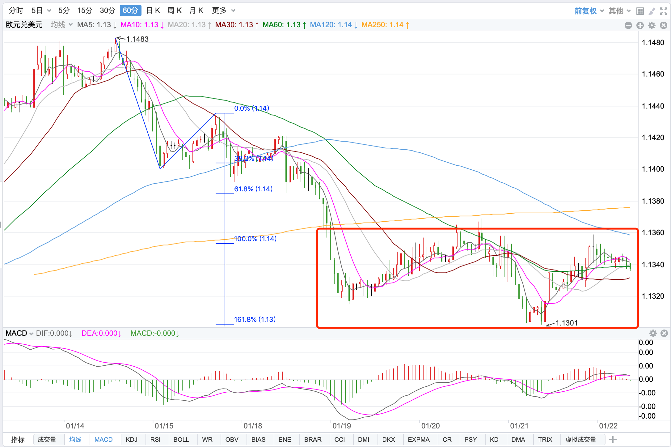 前期自2020年3月底企稳1.0635低点开启上涨走势;2021年1月触及1.23495点的高位后持续震荡下行。2021年11月跌破60周MA均线支持,中长期多空分水岭的支持跌破,行情处在回落调整的下行走势中。当前日内短线行情有继续向下的趋势。