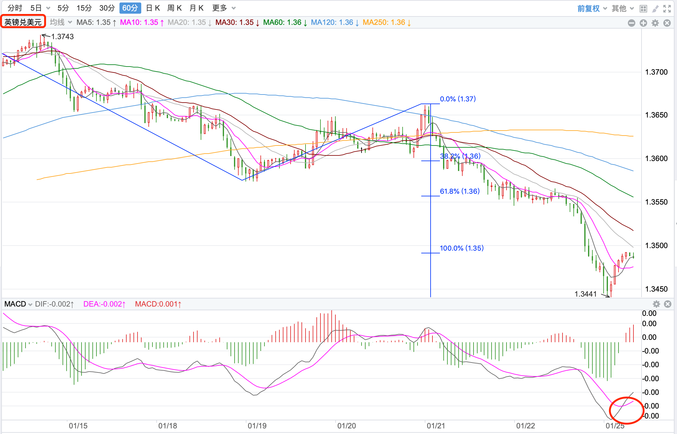 前期自2020年3月底企稳1.0635低点开启上涨走势;2021年1月触及1.23495点的高位后持续震荡下行。2021年11月跌破60周MA均线支持,中长期多空分水岭的支持跌破,行情处在回落调整的下行走势中。当前日内短线行情有继续向下的趋势。