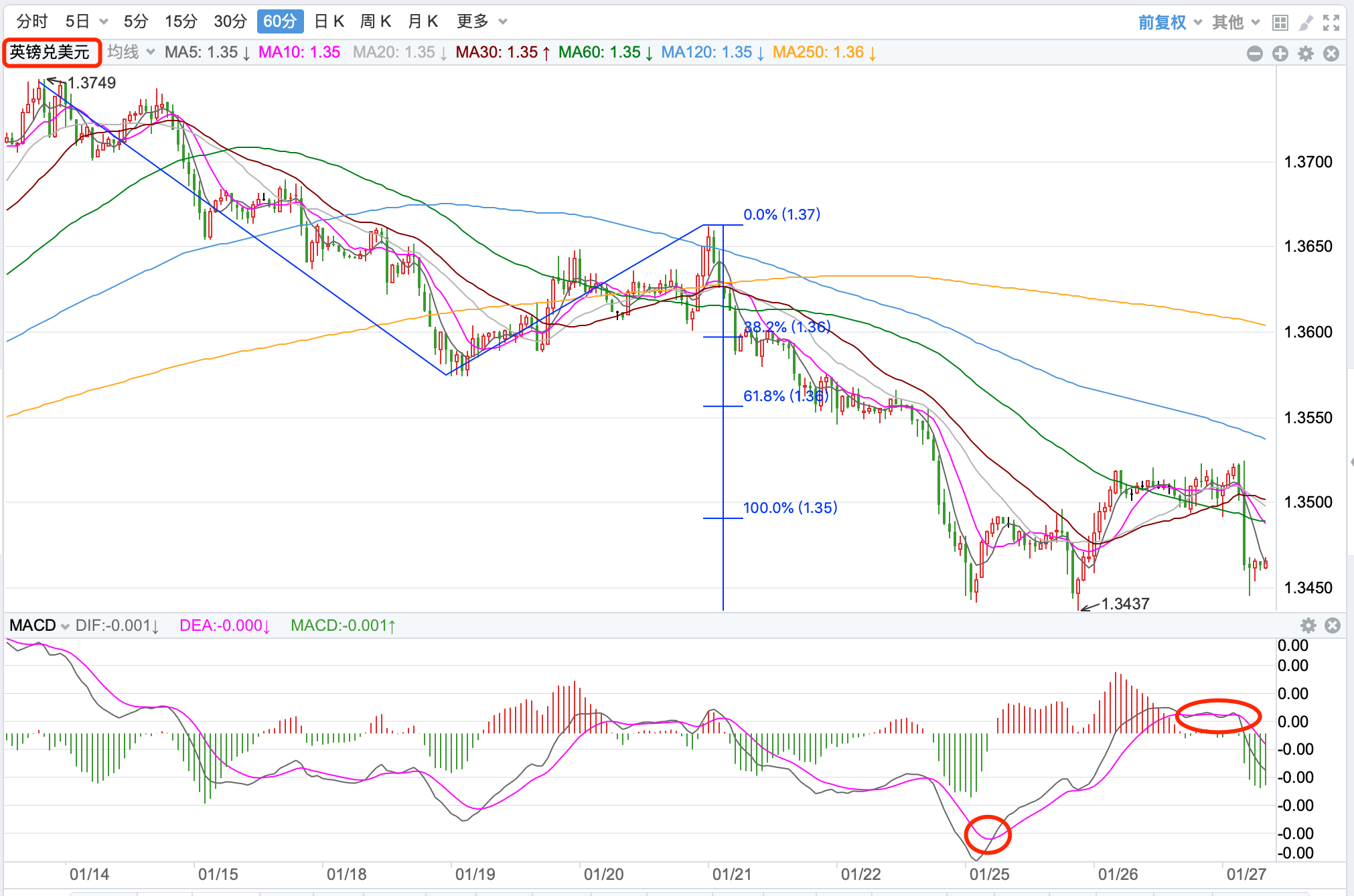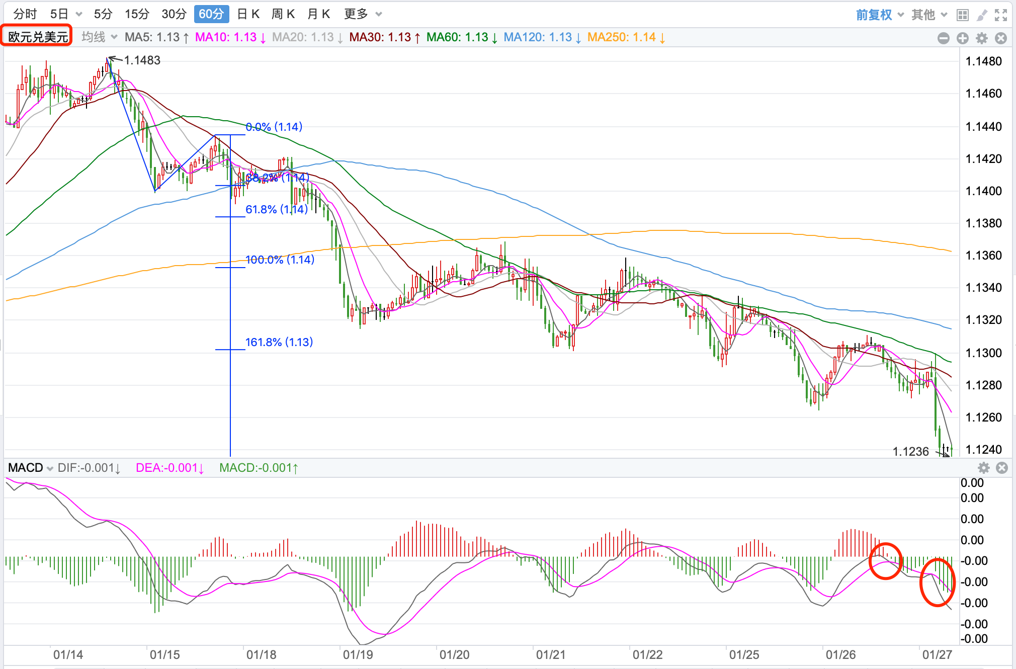 前期自2020年3月底企稳1.0635低点开启上涨走势;2021年1月触及1.23495点的高位后持续震荡下行。2021年11月跌破60周MA均线支持,中长期多空分水岭的支持跌破,行情处在回落调整的下行走势中。当前日内短线行情有继续向下的趋势。