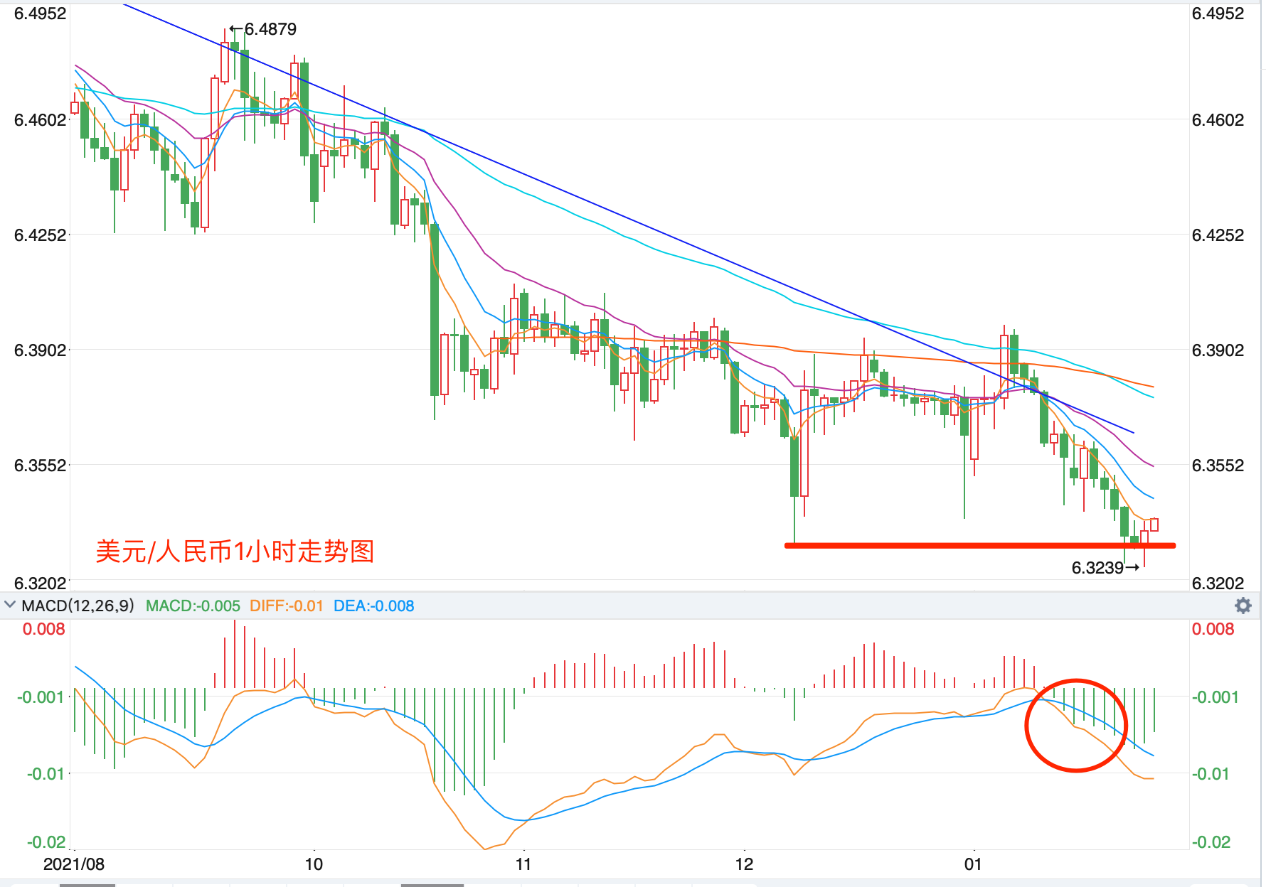 离岸价前期自2020年5月高位7.1964开启下跌走势,盘中跌破MA200均线的关键支持而下行走低;2021年5月触及6.3477点低位后开始震荡走高。2022年1月份保持在6.3-6.4之间震荡调整。当前行情日内有继续反弹调整的趋势。