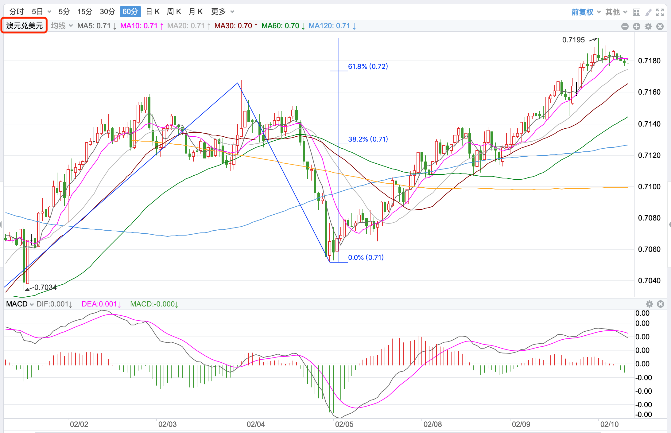 前期自2020年3月底企稳0.5673低点开启上涨走势;盘中突破了MA200均线的关键阻力而上行走高;2021年2月触及0.80072点高位后开始震荡走低,8月底企稳在0.7114点展开反弹走势再度终结,目前重回8月低点调整走势。当前日内短线行情继续向上调整趋势。
