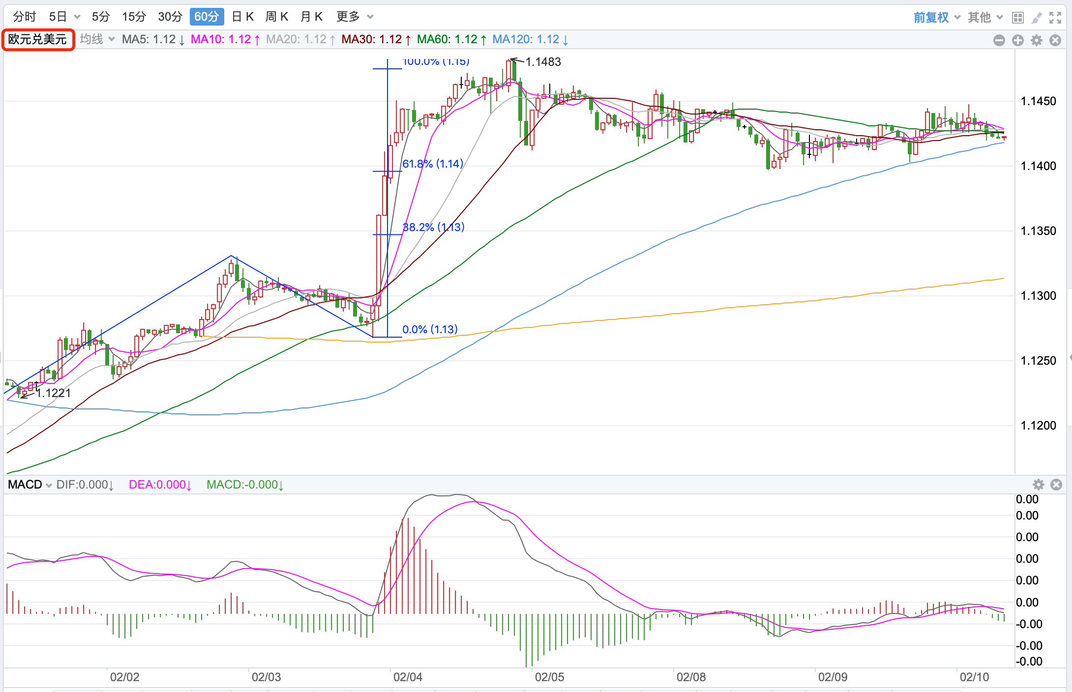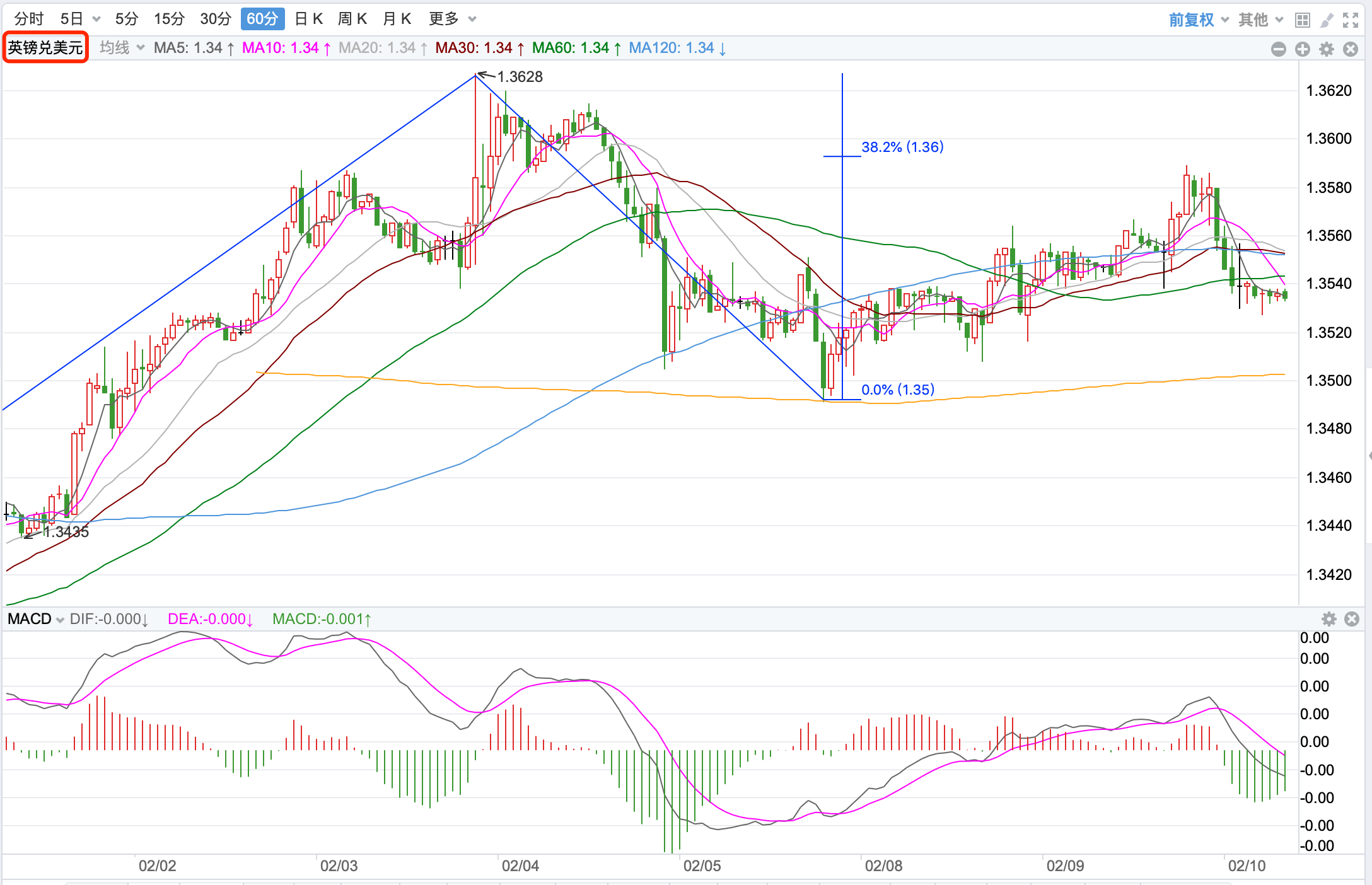 前期自2020年3月底企稳1.0635低点开启上涨走势;2021年1月触及1.23495点的高位后持续震荡下行。2021年11月跌破60周MA均线支持,中长期多空分水岭的支持跌破,行情处在回落调整的下行走势中。当前日内短线行情有回落调整的趋势。
