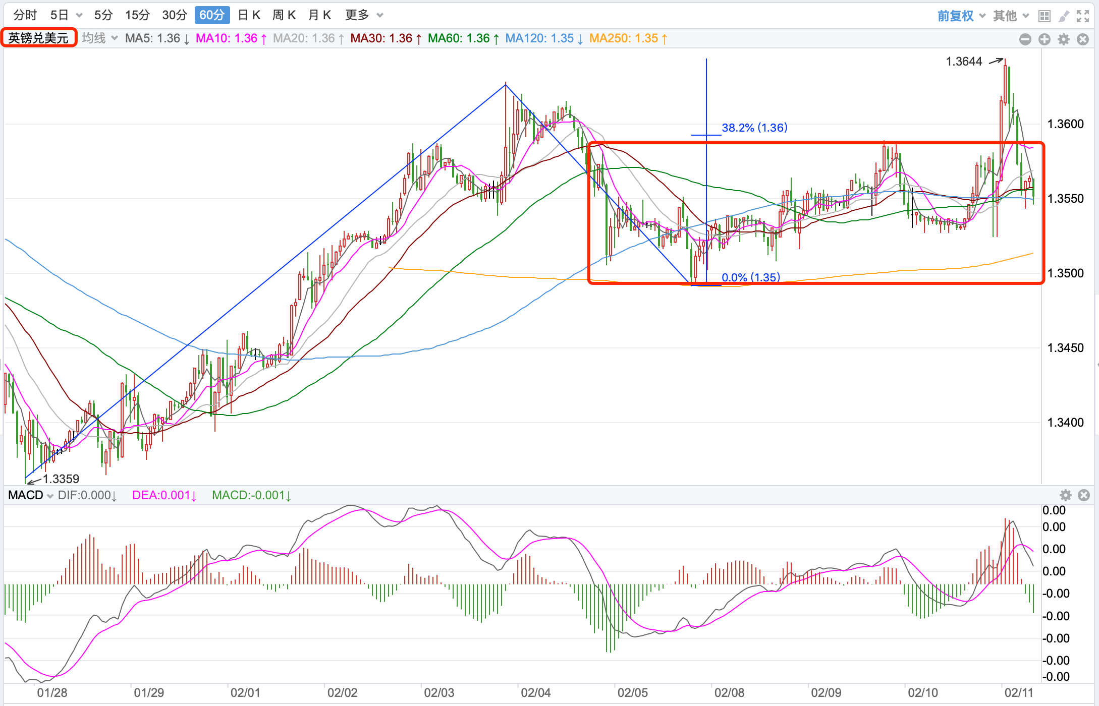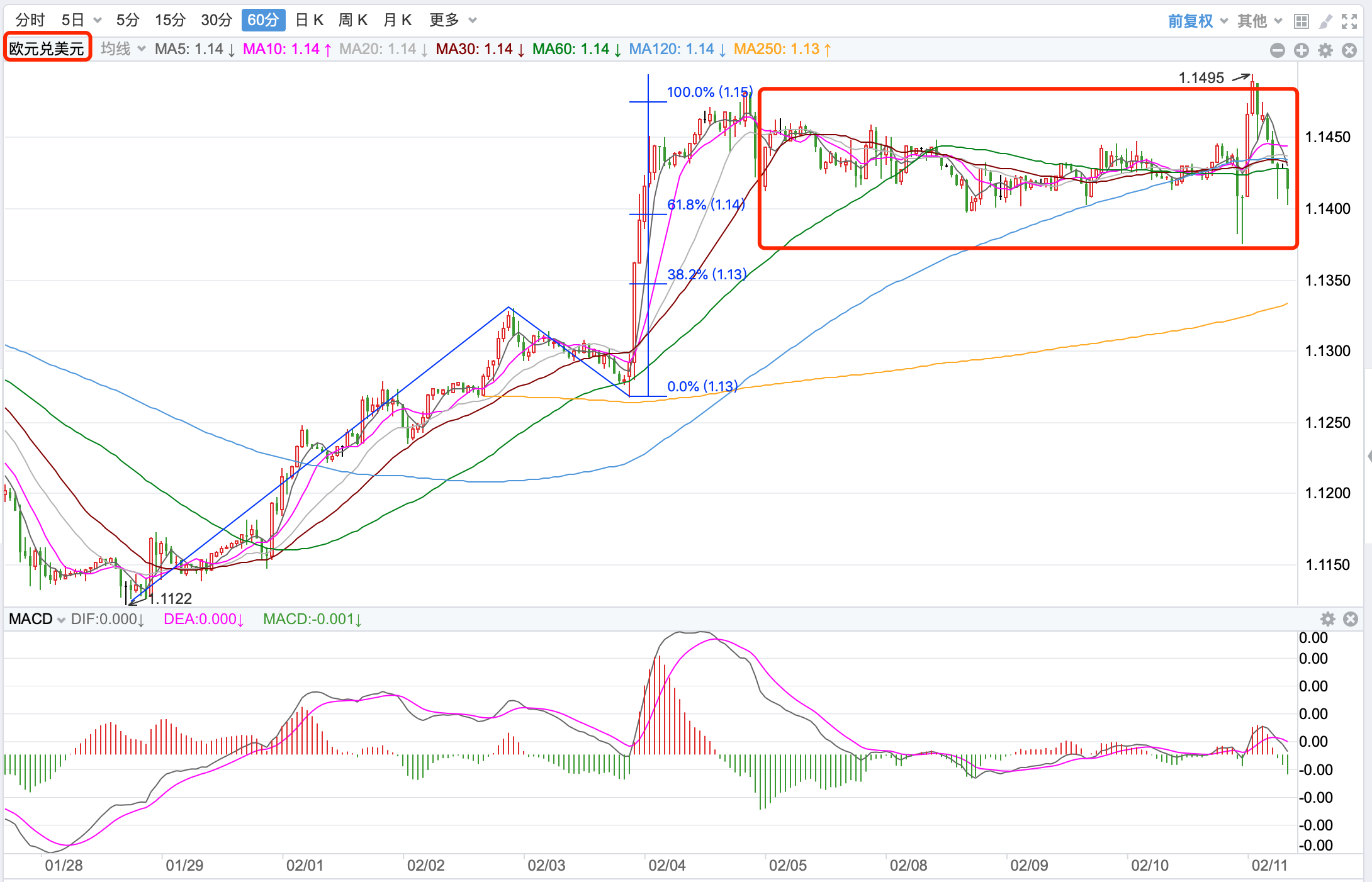 前期自2020年3月底企稳1.0635低点开启上涨走势;2021年1月触及1.23495点的高位后持续震荡下行。2021年11月跌破60周MA均线支持,中长期多空分水岭的支持跌破,行情处在回落调整的下行走势中。当前日内短线行情有回落调整的趋势。