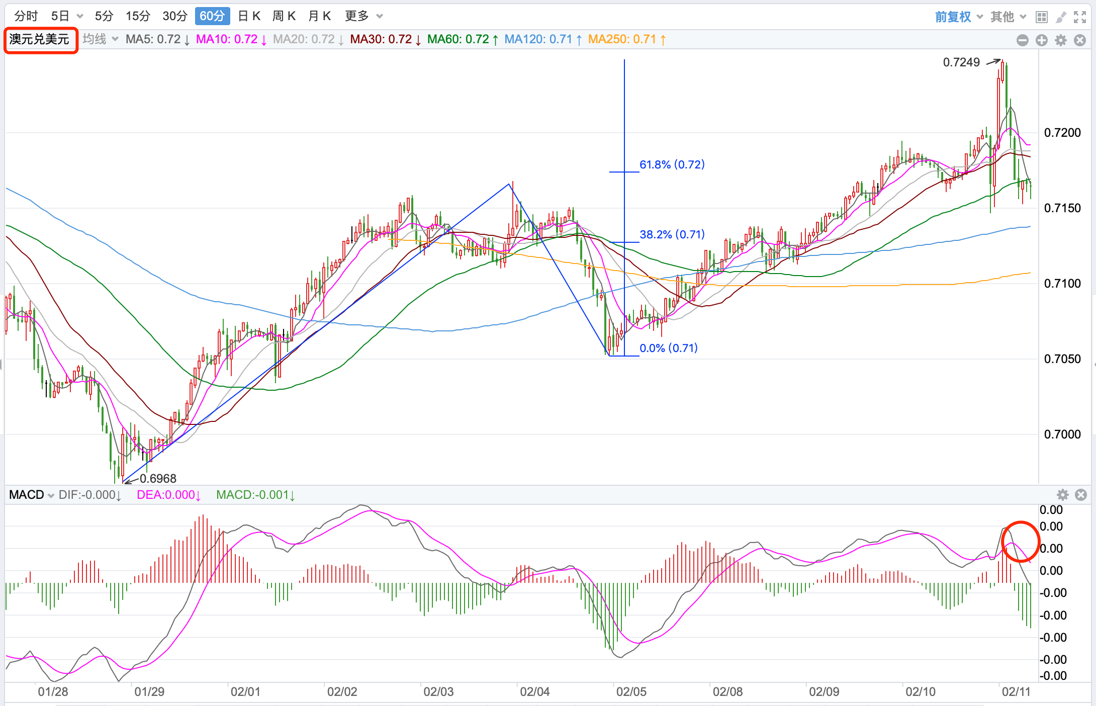 前期自2020年3月底企稳0.5673低点开启上涨走势;盘中突破了MA200均线的关键阻力而上行走高;2021年2月触及0.80072点高位后开始震荡走低,8月底企稳在0.7114点展开反弹走势再度终结,目前重回8月低点调整走势。当前日内短线行情下跌的趋势。