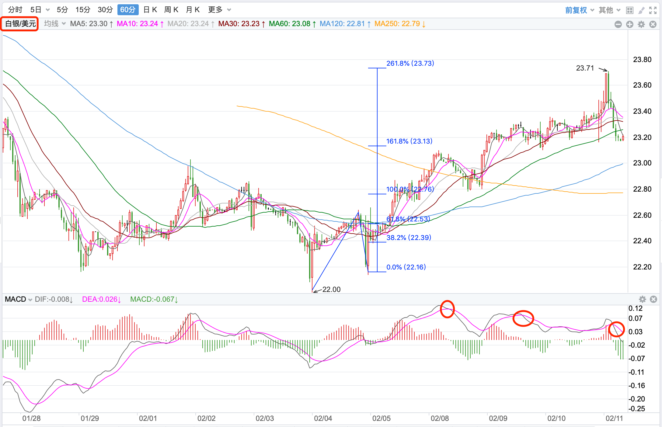 银价从19.64/盎司附近大幅下跌回落,创出五年来的新低到11.29美元附近,随后价格一路反弹上行,两次上涨达到30美元后展开回落。目前整体价格在MA200下方运行,MACD指标企稳弱势震荡,60均线跌破打开下跌空间。日内短线有向下调整的趋势。