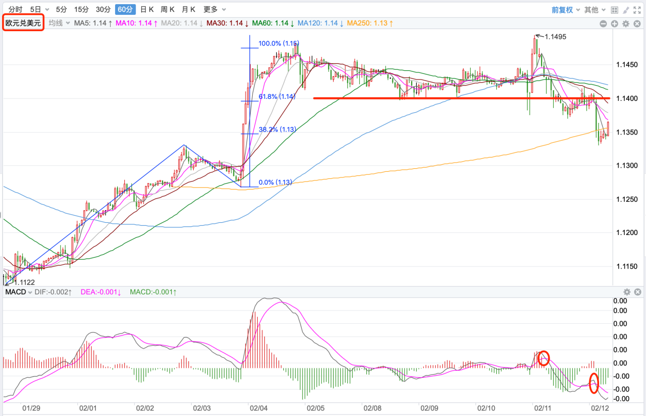 前期自2020年3月底企稳1.0635低点开启上涨走势;2021年1月触及1.23495点的高位后持续震荡下行。2021年11月跌破60周MA均线支持,中长期多空分水岭的支持跌破,行情处在回落调整的下行走势中。当前日内短线行情有回落调整的趋势。