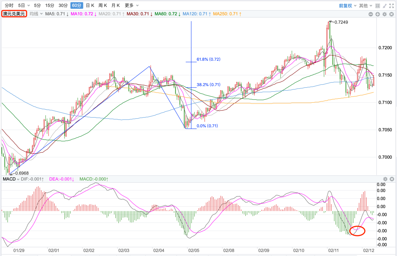 前期自2020年3月底企稳0.5673低点开启上涨走势;盘中突破了MA200均线的关键阻力而上行走高;2021年2月触及0.80072点高位后开始震荡走低,8月底企稳在0.7114点展开反弹走势再度终结,目前重回8月低点调整走势。当前日内短线行情继续下跌的趋势。