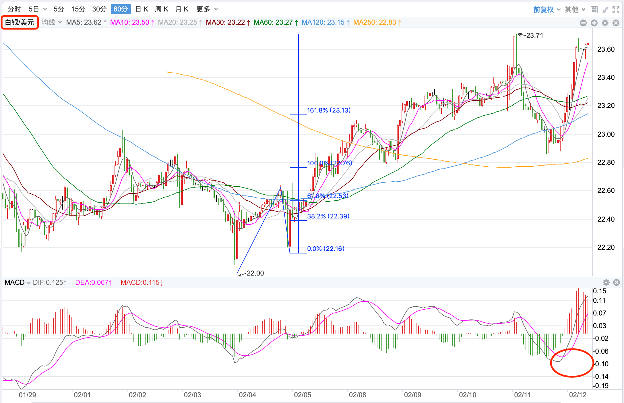 美元指数前期持续上涨在2020年3月份创出102.99点的高位后一路震荡回落走低,2021年1月份触及89.206点的低位后,开始向上持续震荡走高;2021年11月份指数突破MA60周线后保持其上运行,也已经打开了中长期上升的空间。当前指数站稳中期走势的支持上运行,当前日内短线行情有继续反弹的趋势。