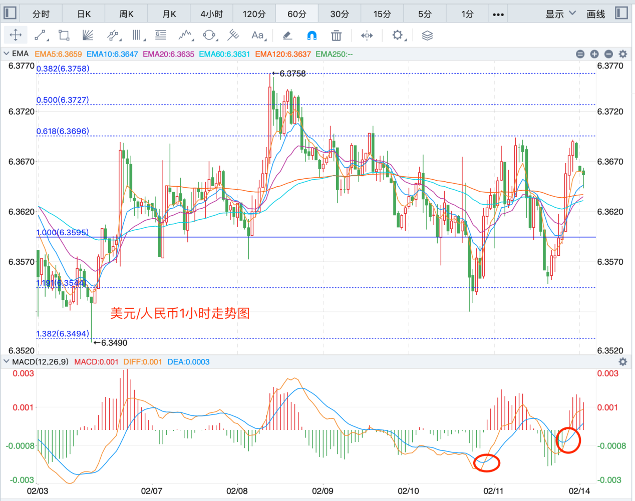 离岸价前期自2020年5月高位7.1964开启下跌走势,盘中跌破MA200均线的关键支持而下行走低;2021年5月触及6.3477点低位后开始震荡走高。2022年1月份保持在6.3-6.4之间震荡调整。当前行情日内有继续反弹向上的趋势。