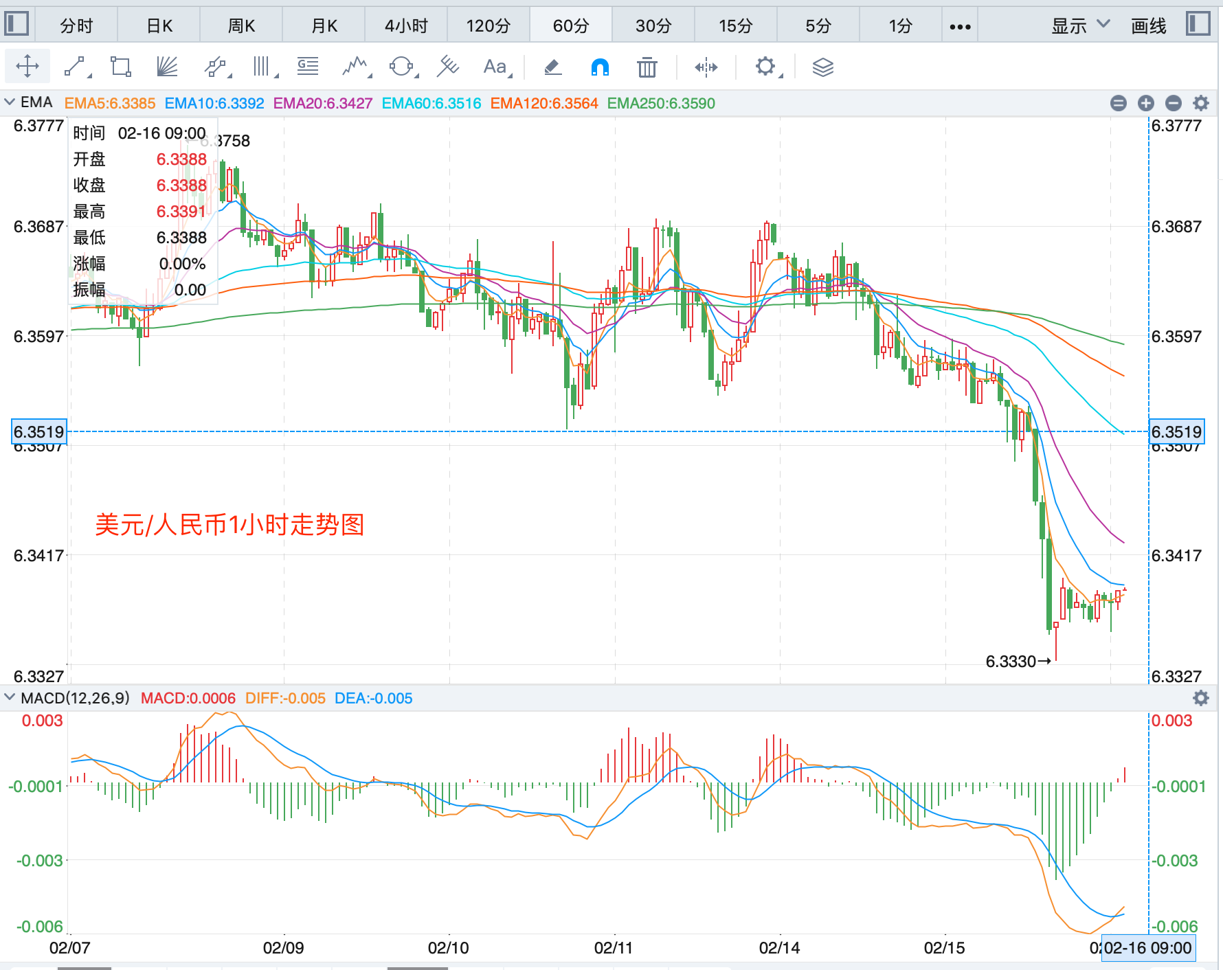 离岸价前期自2020年5月高位7.1964开启下跌走势,盘中跌破MA200均线的关键支持而下行走低;2021年5月触及6.3477点低位后开始震荡走高。2022年1月份保持在6.3-6.4之间震荡调整。当前行情日内有继续下跌的趋势。