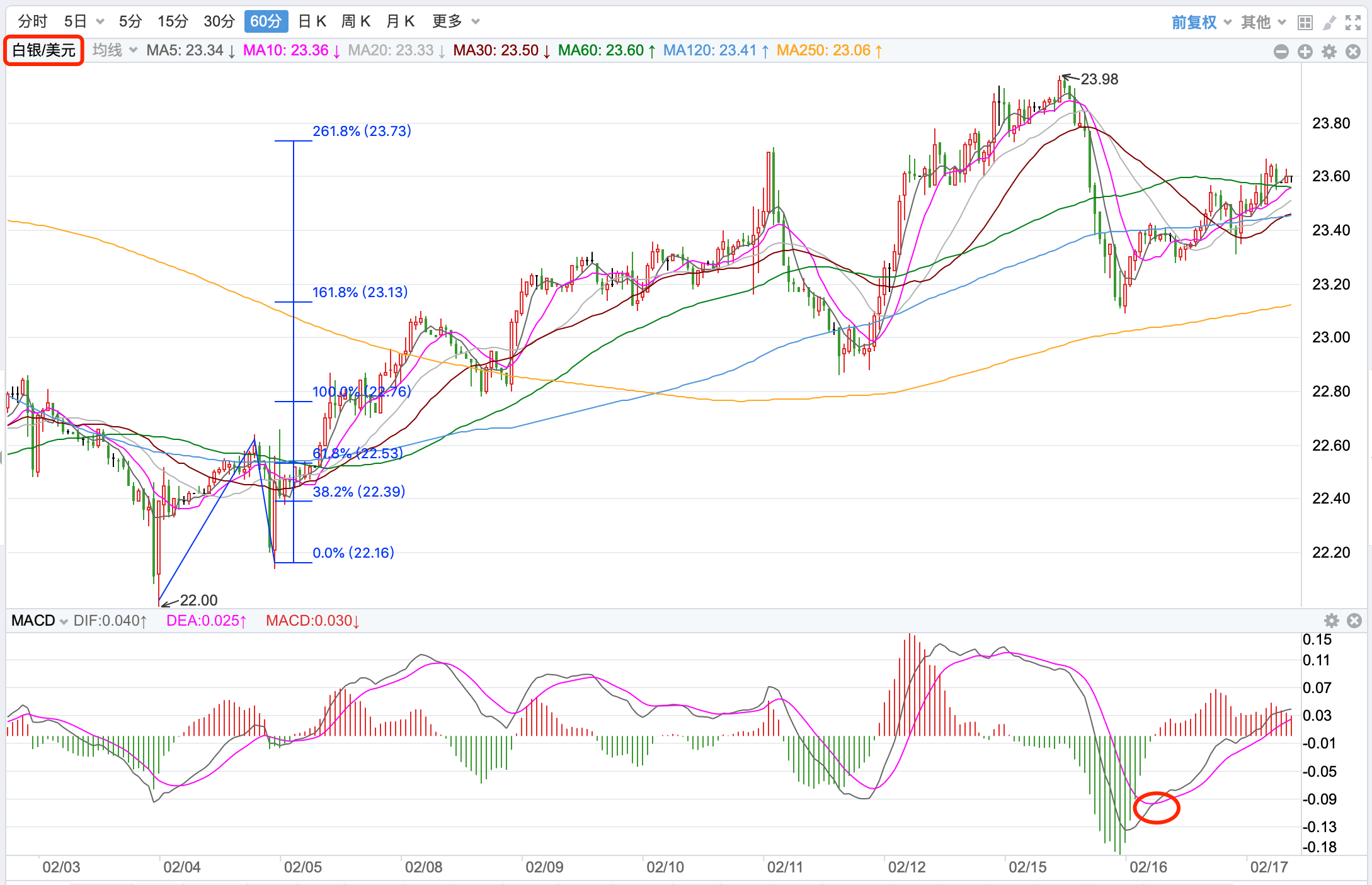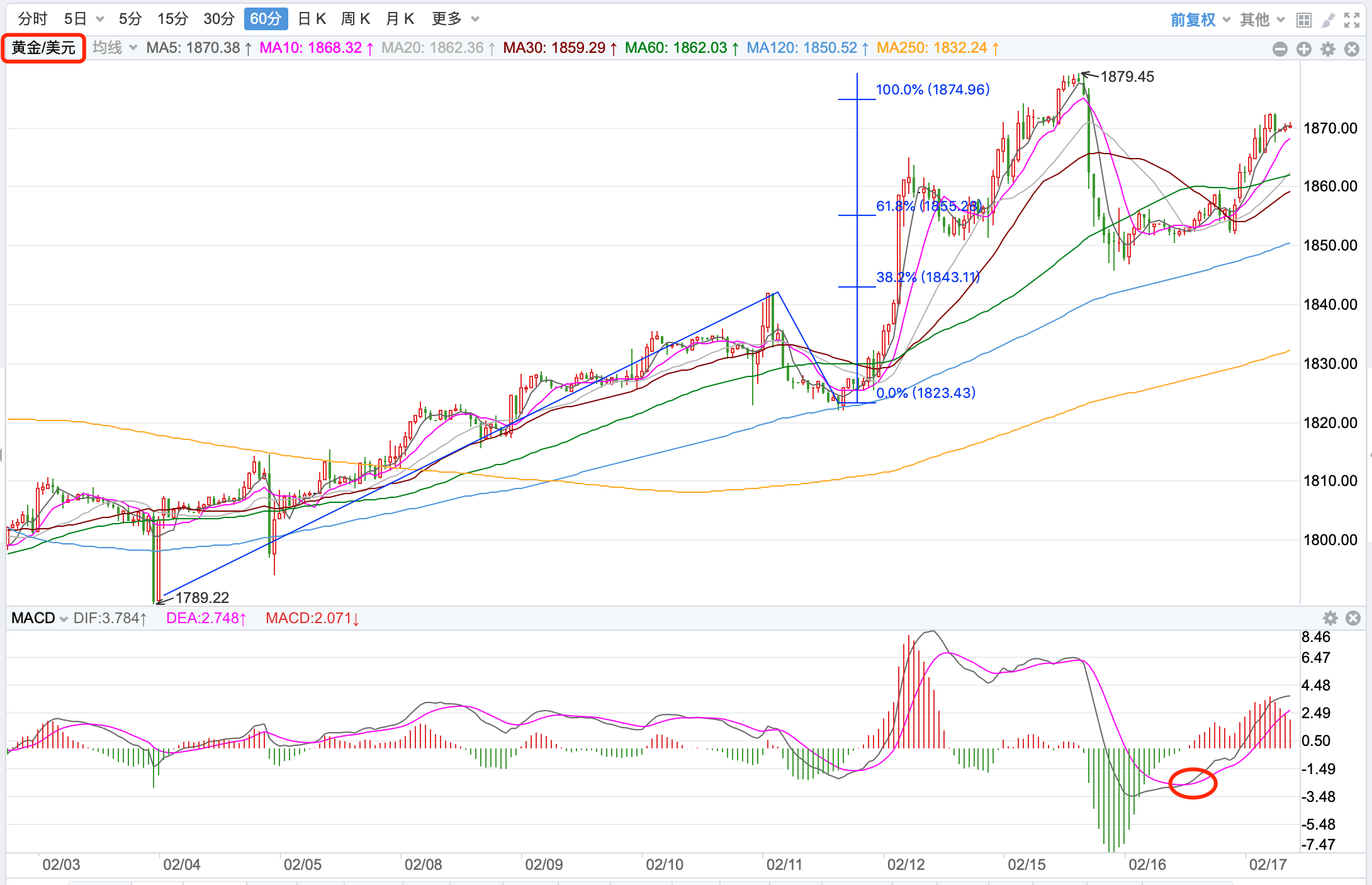 金价从1445美元/盎司的前期低点一路展开上行,创出之前2075的新高后,先回落后持续震荡下跌达到15个多月。当前整体价格在MA200上下运行,MACD指标弱势震荡,形成触底反弹的走势。近期短线1760美元是多头关键的支持,日内短线有触顶回落的趋势。