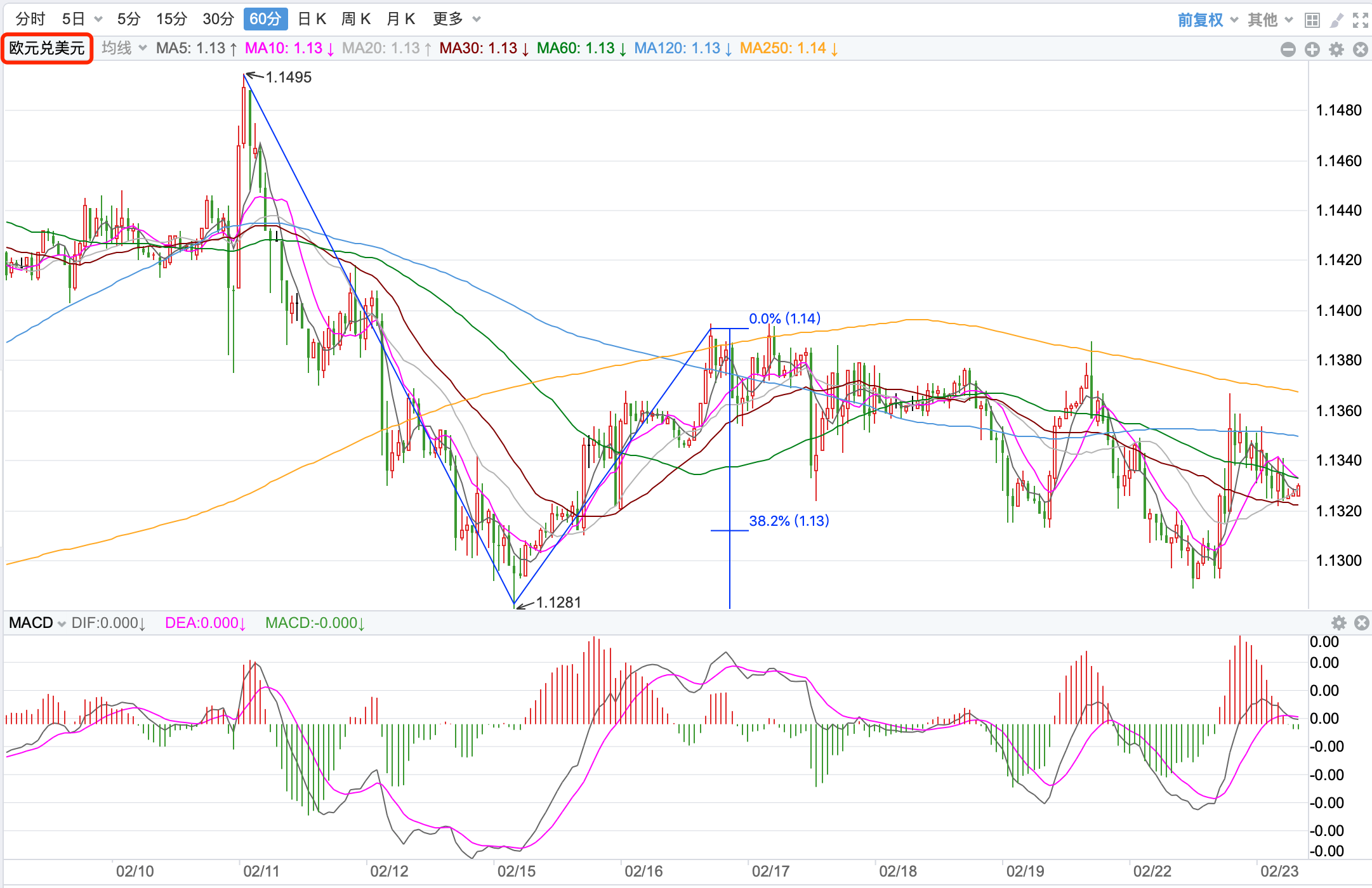 前期自2020年3月底企稳1.0635低点开启上涨走势;2021年1月触及1.23495点的高位后持续震荡下行。2021年11月跌破60周MA均线支持,中长期多空分水岭的支持跌破,行情处在回落调整的下行走势中。当前日内短线行情有继续下行的趋势。