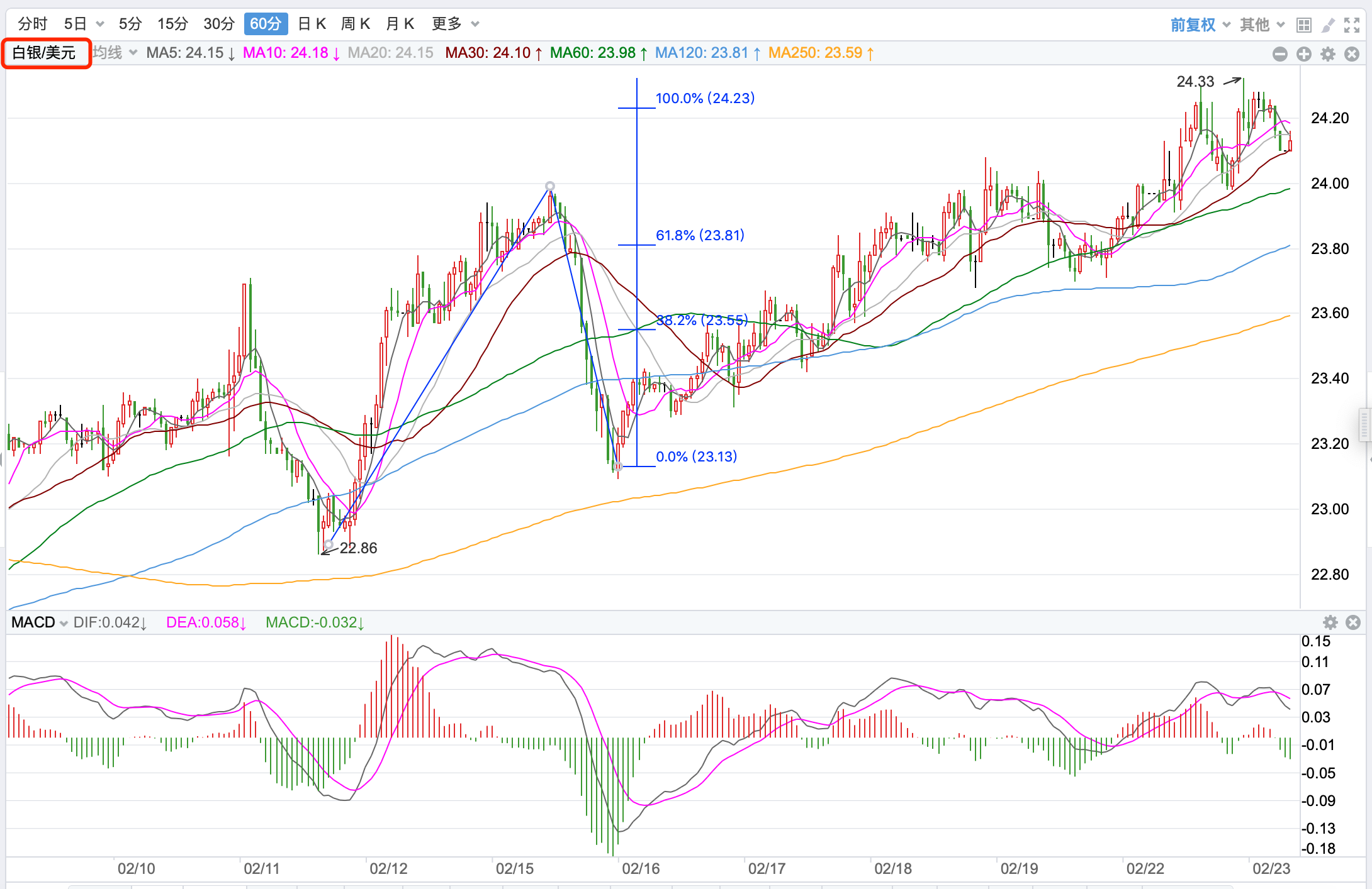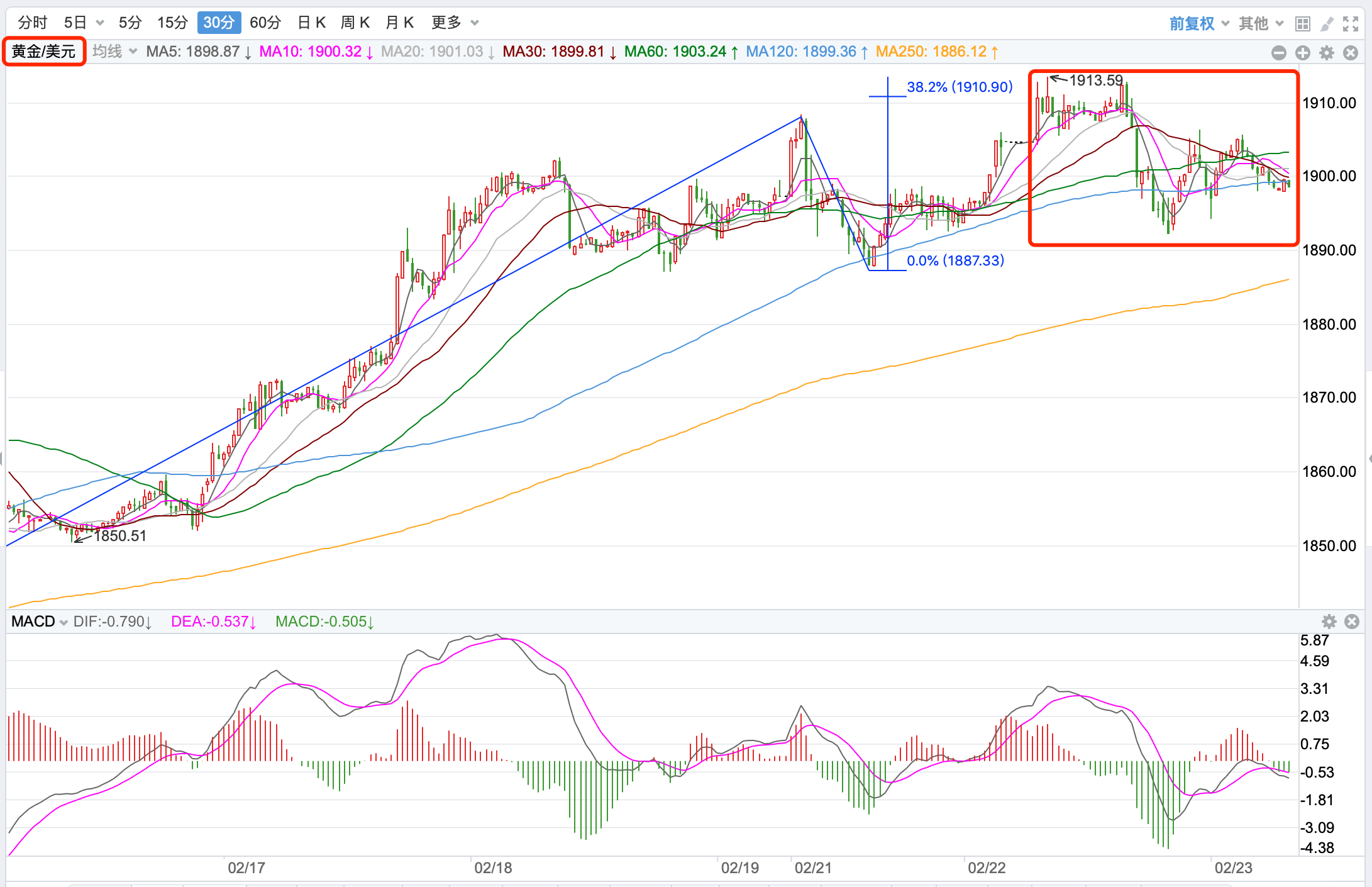 贵金属市场,黄金白银因乌克兰边境危机重新升温再次走高,周二出现回落调整的走势,今早盘震荡在1899.17美元/盎司附近。(期货黄金周二夜盘收至388.90元/克,跌幅-0.07%)。白银盘中继续冲高反弹,收盘至24.13美元/盎司附近,涨幅为0.6%(期货白银周二夜盘收涨至4981元/千克,涨幅达到0.83%)。纽约商品交易所黄金期货市场交投最活跃的4月黄金期价22日比前一交易日上涨7.6美元,收于每盎司1907.4美元,涨幅为0.4%。金银大涨后迎来调整走势,向上运行空间打开看多为主的趋势延续。