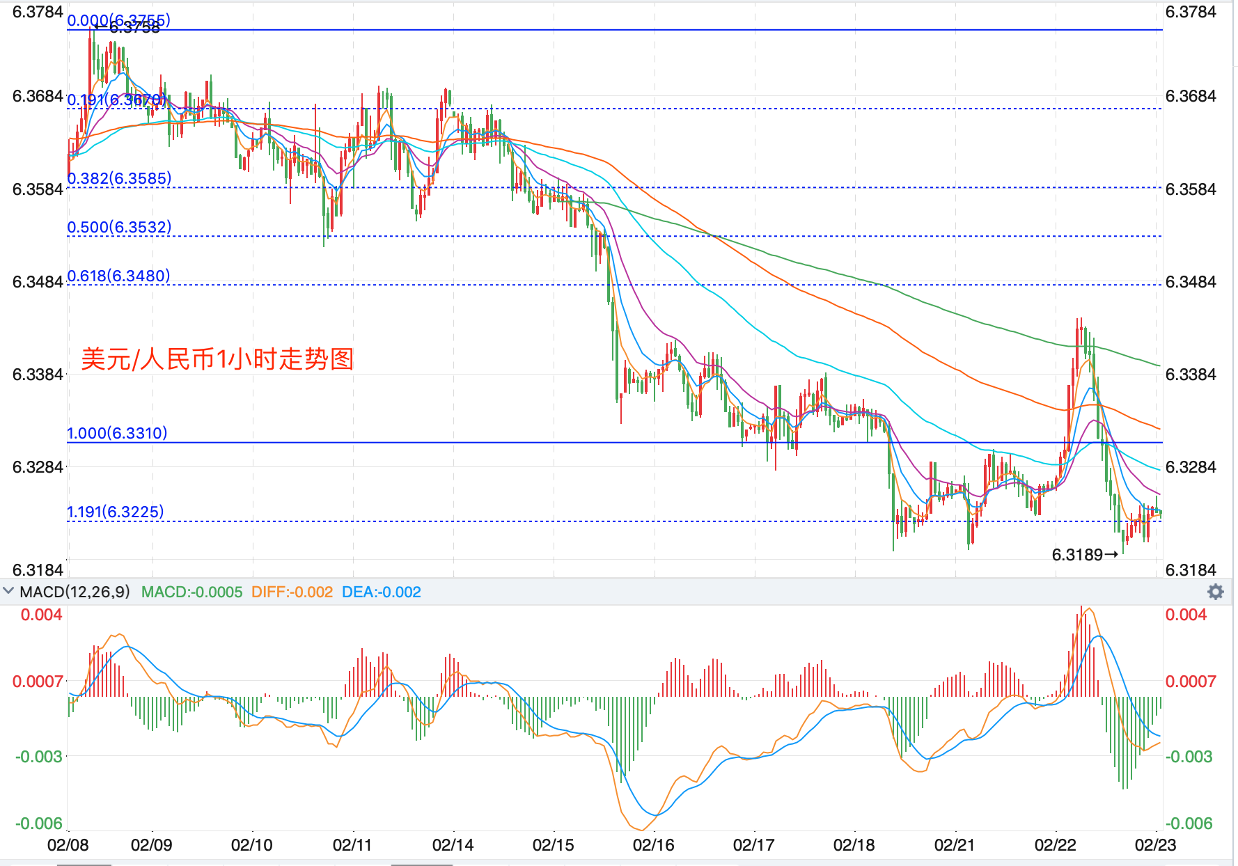 离岸价前期自2020年5月高位7.1964开启下跌走势,盘中跌破MA200均线的关键支持而下行走低;2021年5月触及6.3477点低位后开始震荡走高。2022年2月自6.3758开始回落走低,人民币相对美元继续升值,不过走势依然保持在6.3-6.4之间调整。当前行情日内有触底反弹的趋势。