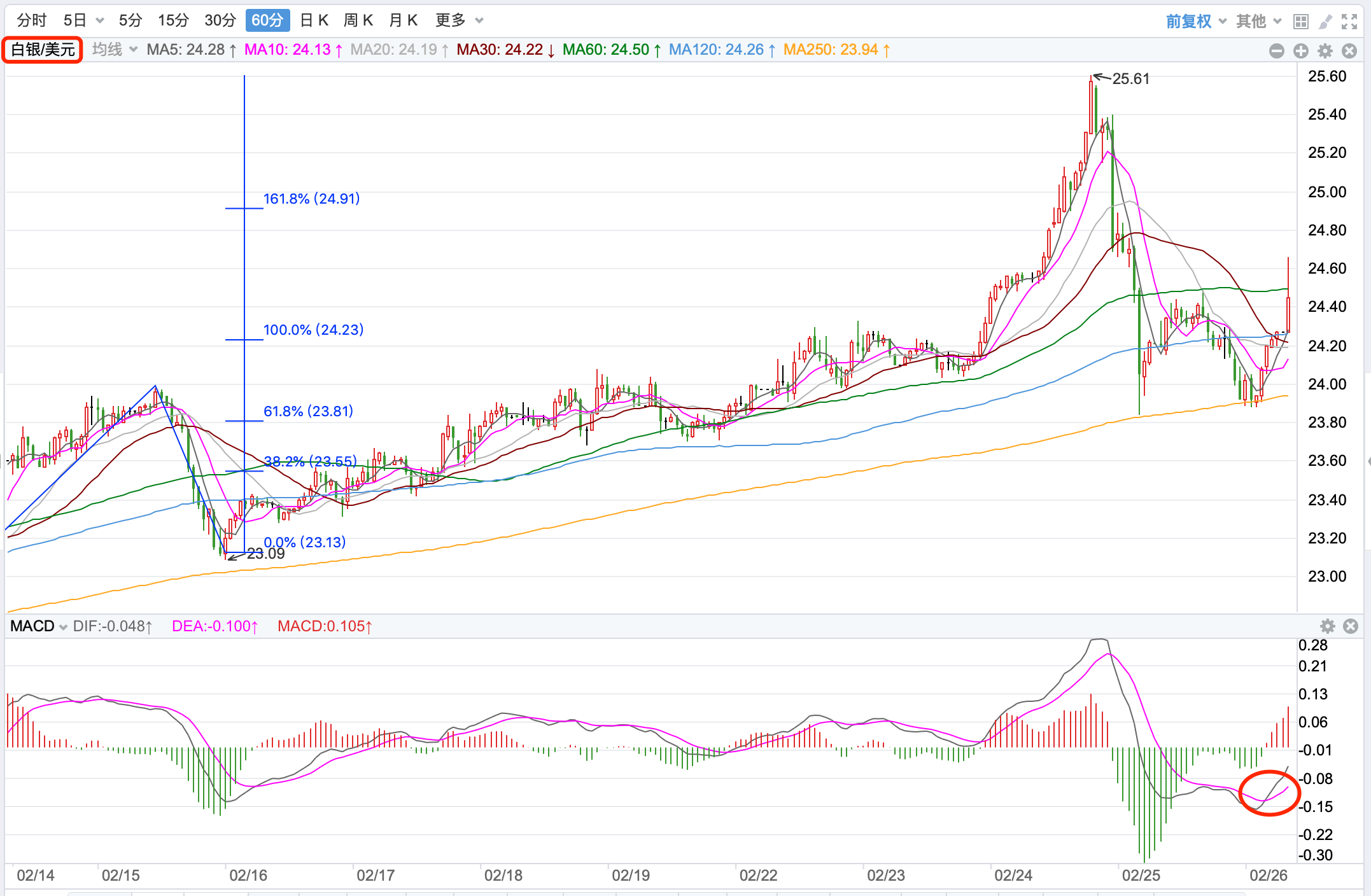 银价从19.64/盎司附近大幅下跌回落,创出五年来的新低到11.29美元附近,随后价格一路反弹上行,两次上涨达到30美元后展开回落。目前整体价格在MA200下方运行,MACD指标企稳弱势震荡,60均线跌破打开下跌空间。日内短线有继续向上反弹的趋势。