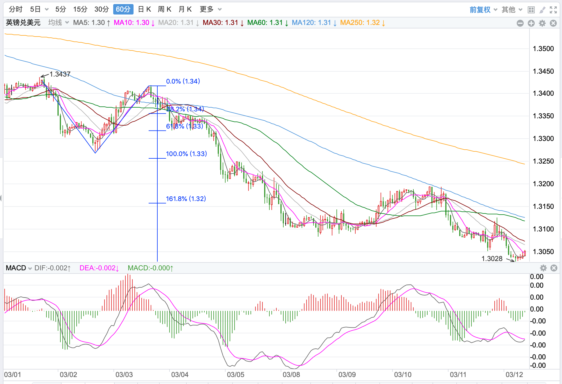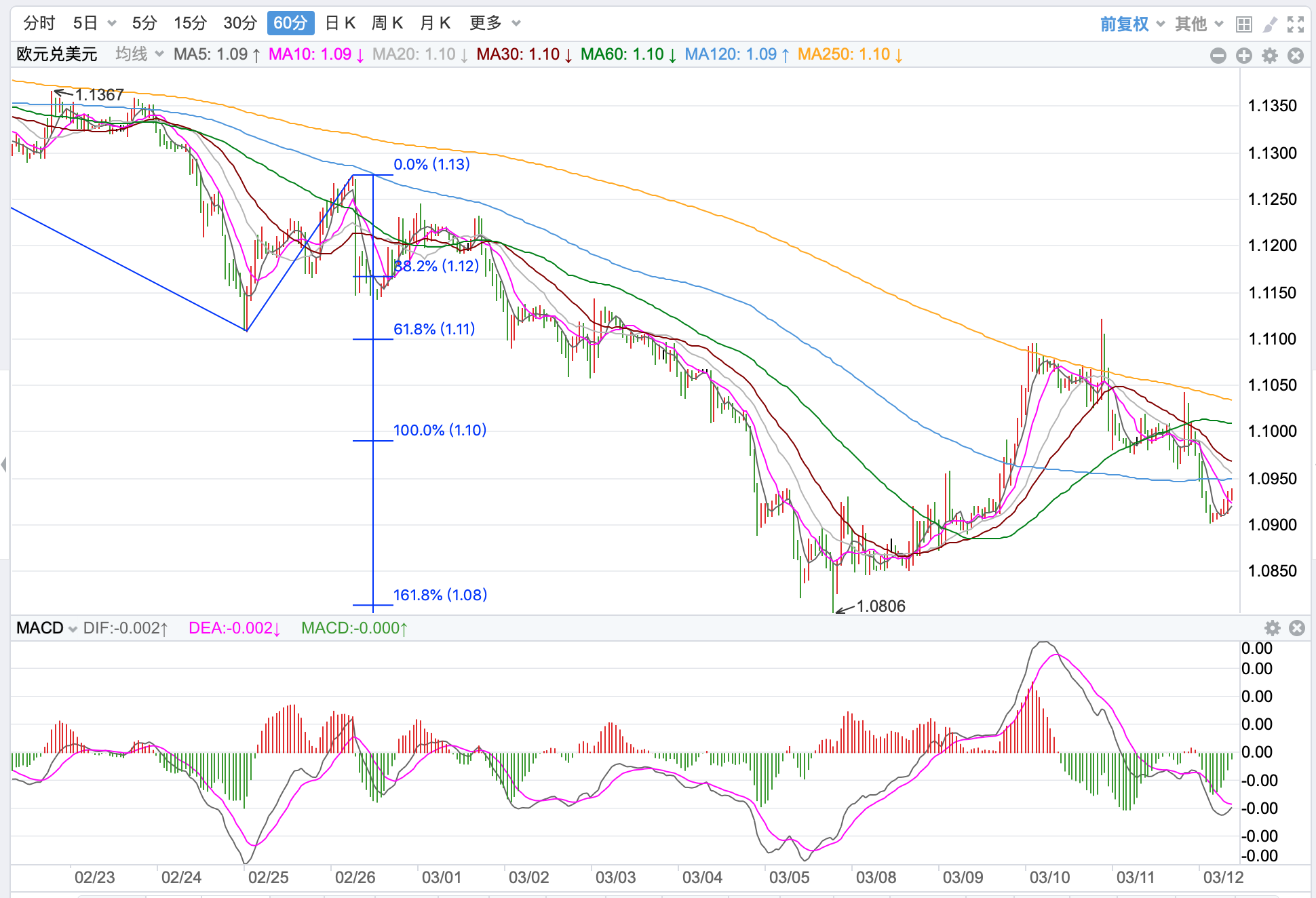 前期自2020年3月底企稳1.0635低点开启上涨走势;2021年1月触及1.23495点的高位后持续震荡下行。2021年11月跌破60周MA均线支持,中长期多空分水岭的支持跌破,行情处在回落调整的下行走势中。当前日内短线行情回落探底的趋势。