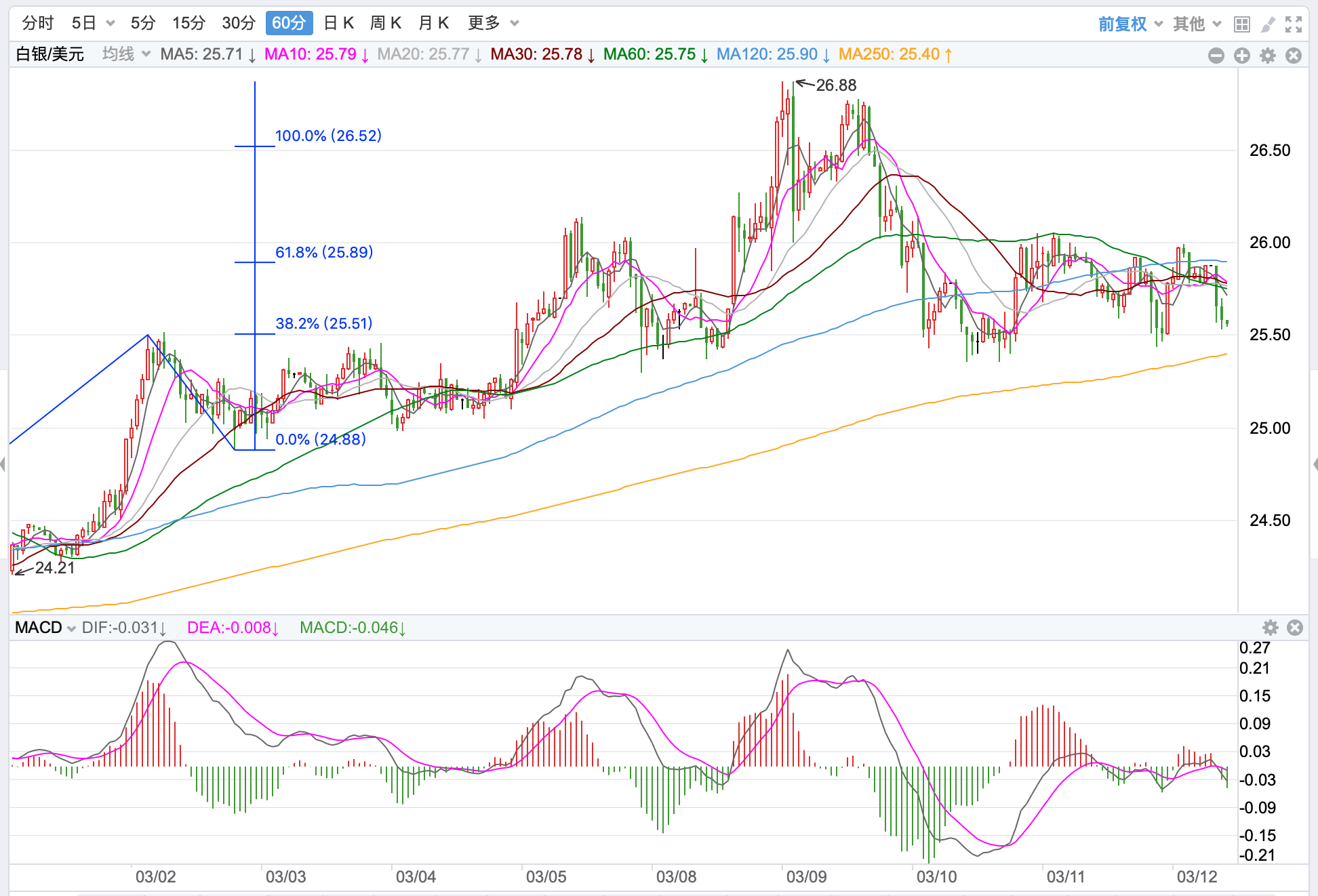 银价从19.64/盎司附近大幅下跌回落,创出五年来的新低到11.29美元附近,随后价格一路反弹上行,两次上涨达到30美元后展开回落。目前整体价格在MA200下方运行,MACD指标企稳弱势震荡,60均线突破企稳打开上行空间延续上涨。近期关键支持是25.5美元,上方关键阻力27美元附近;日内短线有震荡调整的趋势。
