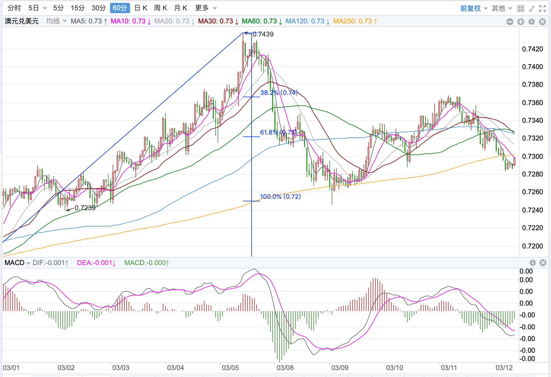 前期自2020年3月底企稳0.5673低点开启上涨走势;盘中突破了MA200均线的关键阻力而上行走高;2021年2月触及0.80072点高位后开始震荡走低,8月底企稳在0.7114点展开反弹走势再度终结,目前重回8月低点调整走势。当前日内短线继续下跌的趋势。