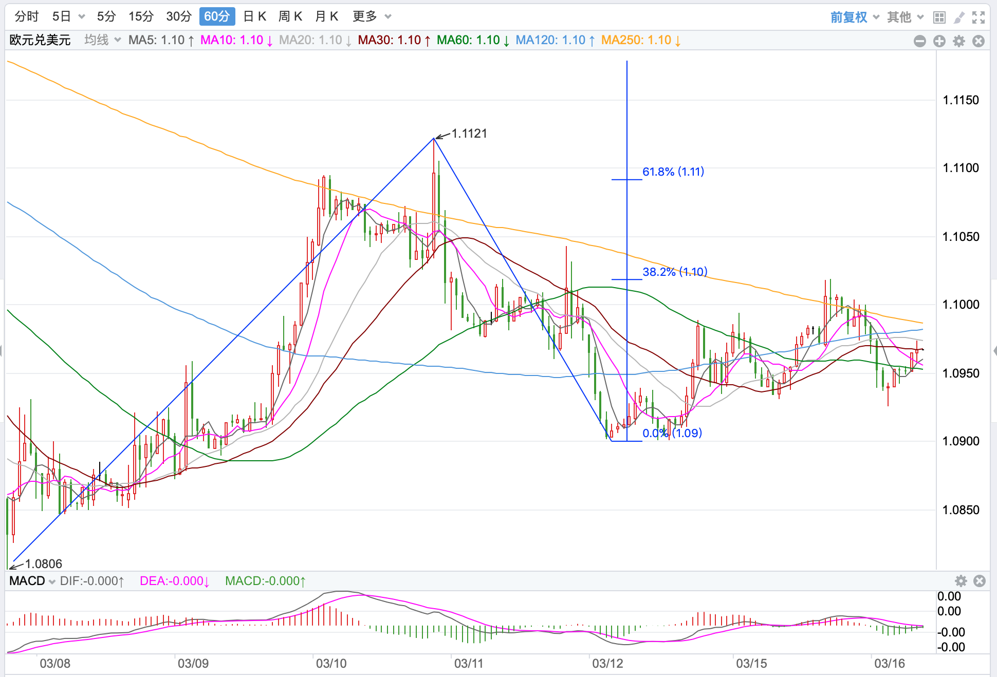前期自2020年3月底企稳1.0635低点开启上涨走势;2021年1月触及1.23495点的高位后持续震荡下行。2021年11月跌破60周MA均线支持,中长期多空分水岭的支持跌破,行情处在回落调整的下行走势中。当前日内短线行情回落探底的趋势。