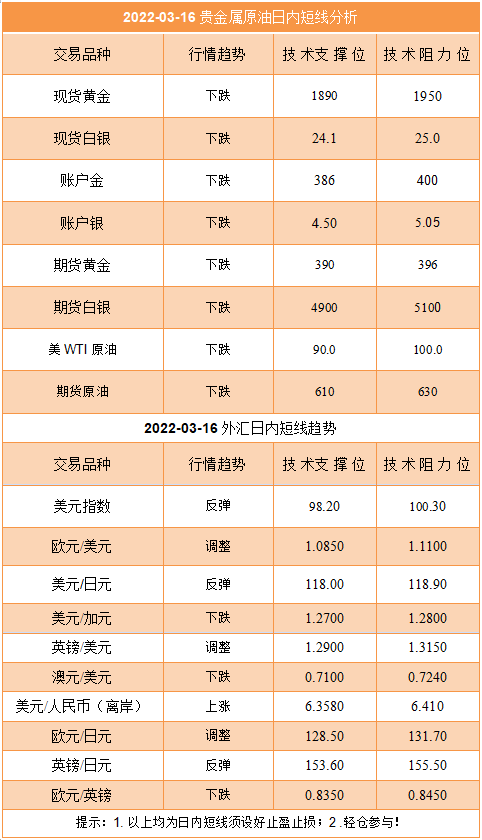 以上几个方面影响外汇市场的走势,就外汇市场整体而言,金砖汇通认为,俄乌战争的影响会让避险货币跌宕起伏,需要注意无法以趋势来判断。美元将在明天凌晨之前维持强势,有知名投行机构认为美联储会加息50个基点,目前市场观点分歧很大。非美货币还将震荡回落调整,但是明天凌晨或许不是追高美元的恰当时机,反而市场可能挖坑等你追高。