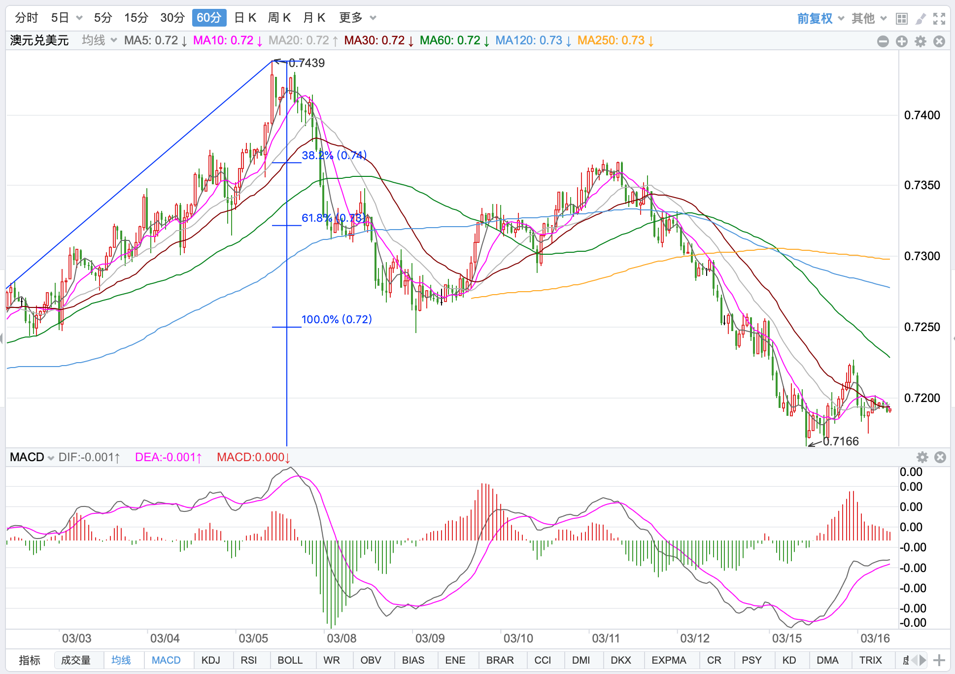 前期自2020年3月底企稳0.5673低点开启上涨走势;盘中突破了MA200均线的关键阻力而上行走高;2021年2月触及0.80072点高位后开始震荡走低,8月底企稳在0.7114点展开反弹走势再度终结,目前重回8月低点调整走势。当前日内短线继续下跌的趋势。