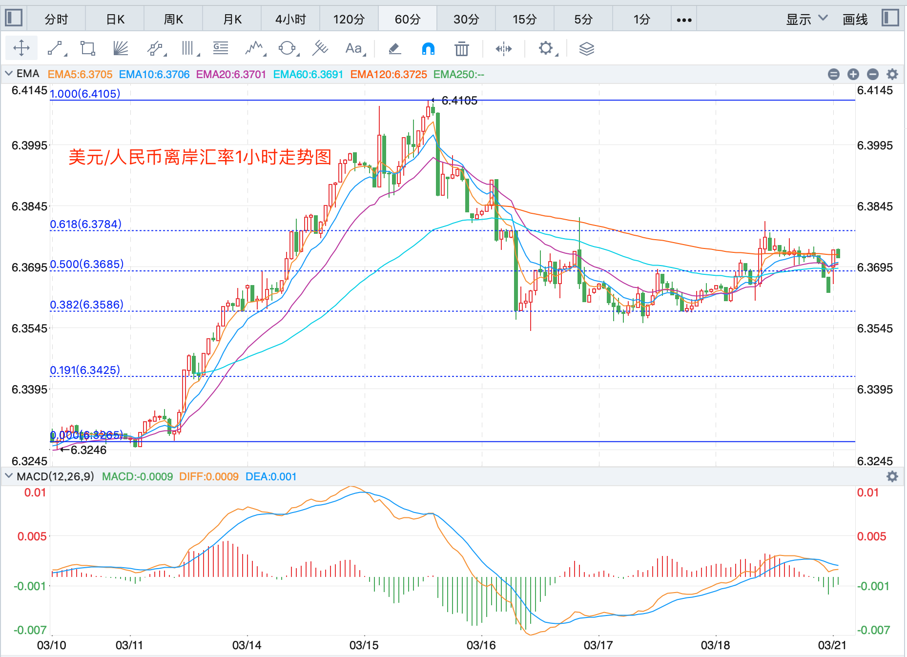 离岸价前期自2020年5月高位7.1964开启下跌走势,盘中跌破MA200均线的关键支持而下行走低;2021年5月触及6.3477点低位后开始震荡走高。2022年2月自6.3758开始回落走低,人民币相对美元继续升值,不过走势依然保持在6.3-6.4之间调整。当前行情日内回落向下的趋势。