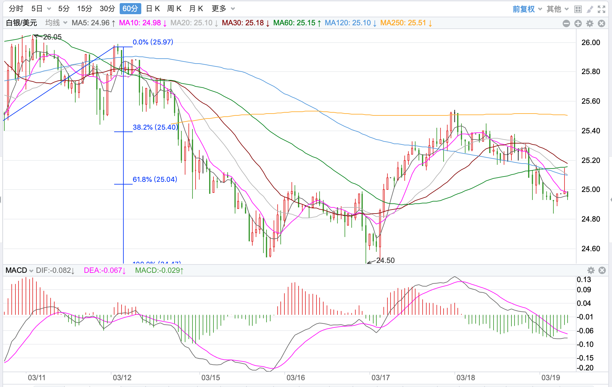 银价从19.64/盎司附近大幅下跌回落,创出五年来的新低到11.29美元附近,随后价格一路反弹上行,两次上涨达到30美元后展开回落。目前整体价格在MA200下方运行,MACD指标企稳弱势震荡,60均线突破企稳打开上行空间延续上涨。近期关键支持是24.0美元,上方关键阻力27美元附近;日内短线有震荡上涨的趋势。