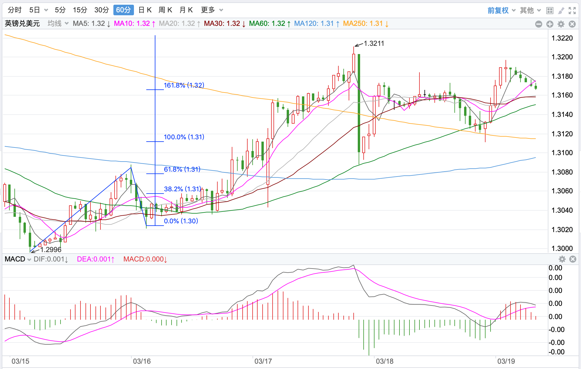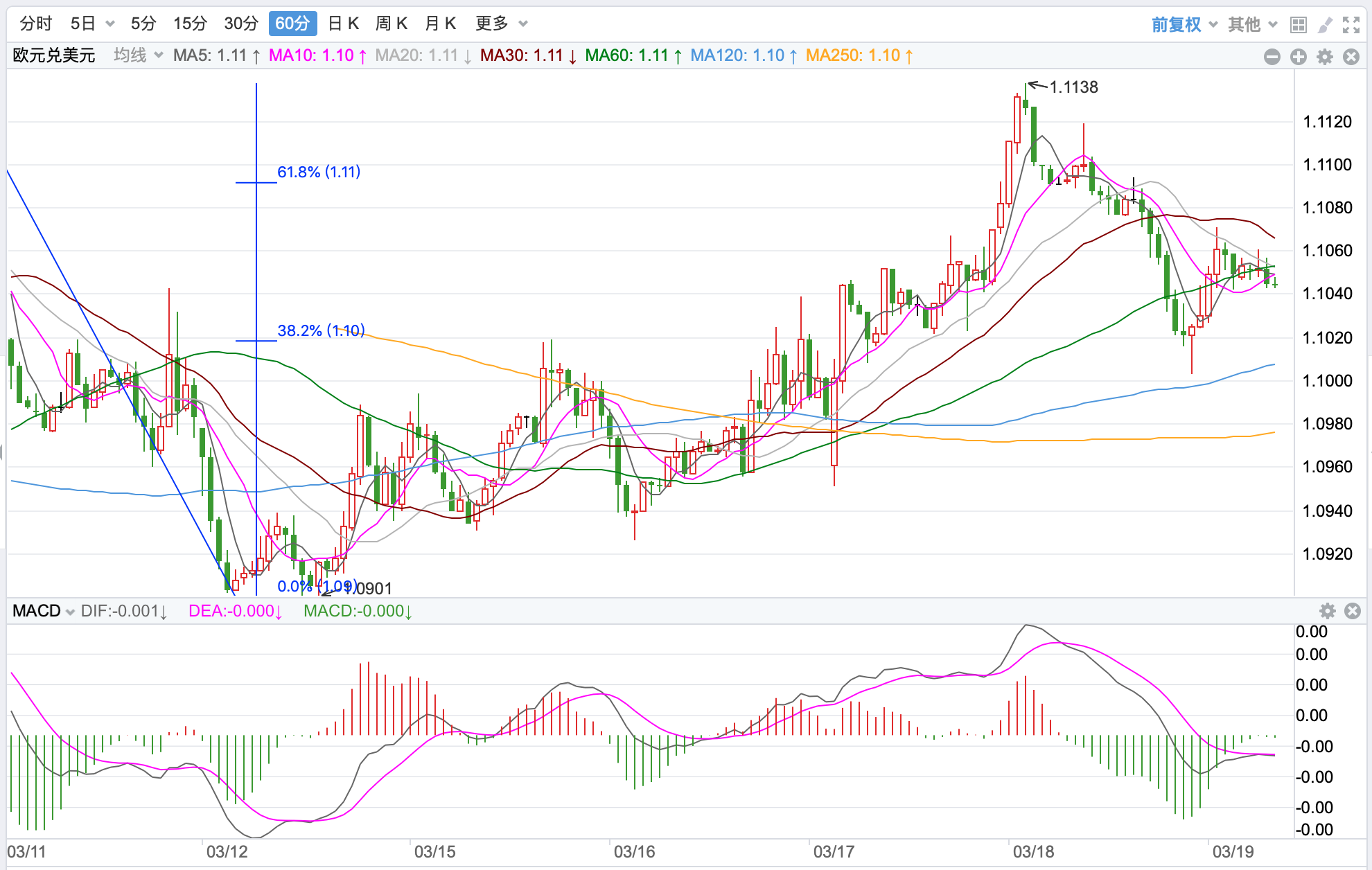 前期自2020年3月底企稳1.0635低点开启上涨走势;2021年1月触及1.23495点的高位后持续震荡下行。2021年11月跌破60周MA均线支持,中长期多空分水岭的支持跌破,行情处在回落调整的下行走势中。当前日内短线行情有继续反弹的趋势。