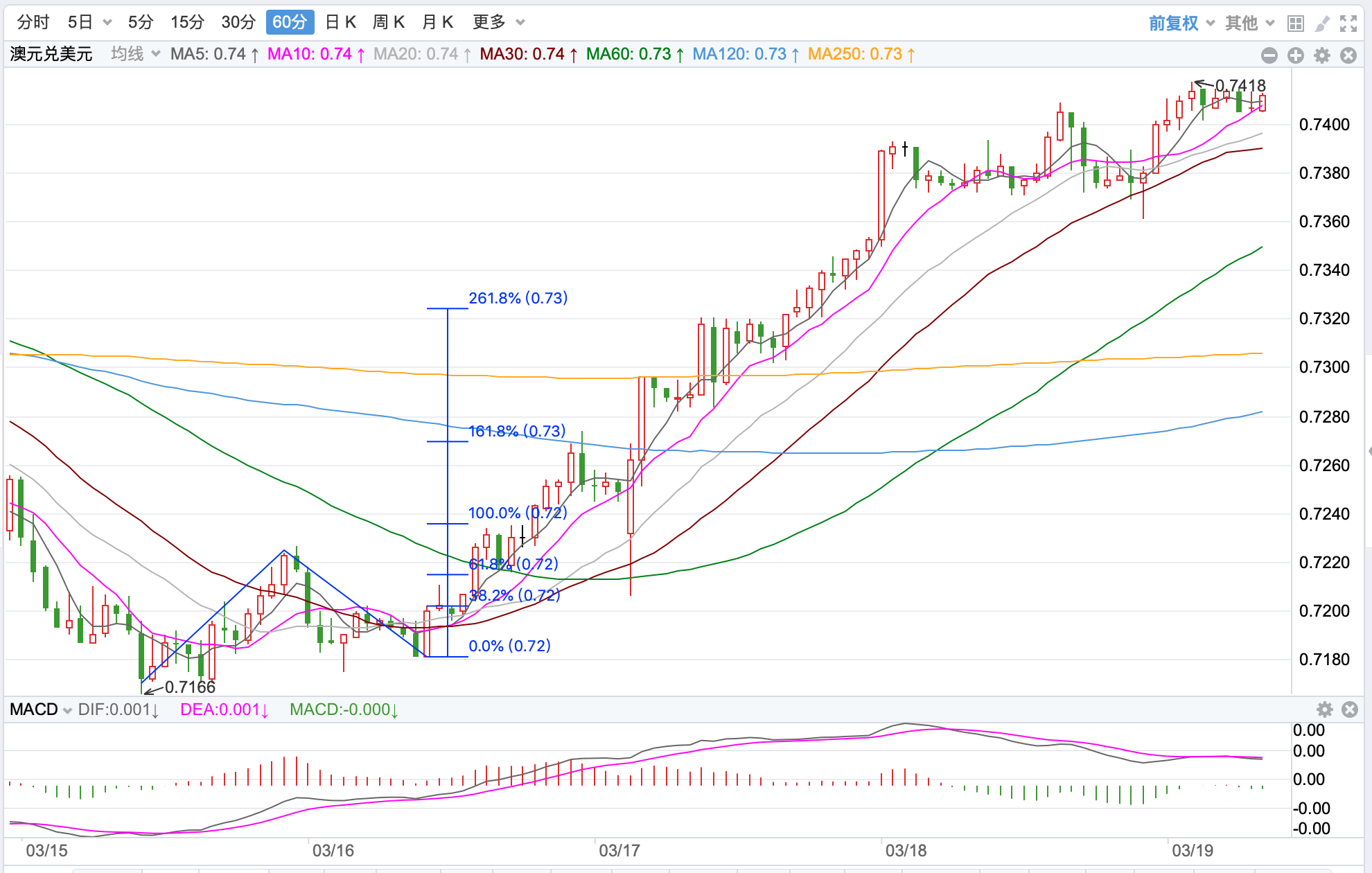 前期自2020年3月底企稳0.5673低点开启上涨走势;盘中突破了MA200均线的关键阻力而上行走高;2021年2月触及0.80072点高位后开始震荡走低,8月底企稳在0.7114点展开反弹走势再度终结,目前重回8月低点调整走势。当前日内短线继续上涨的趋势。