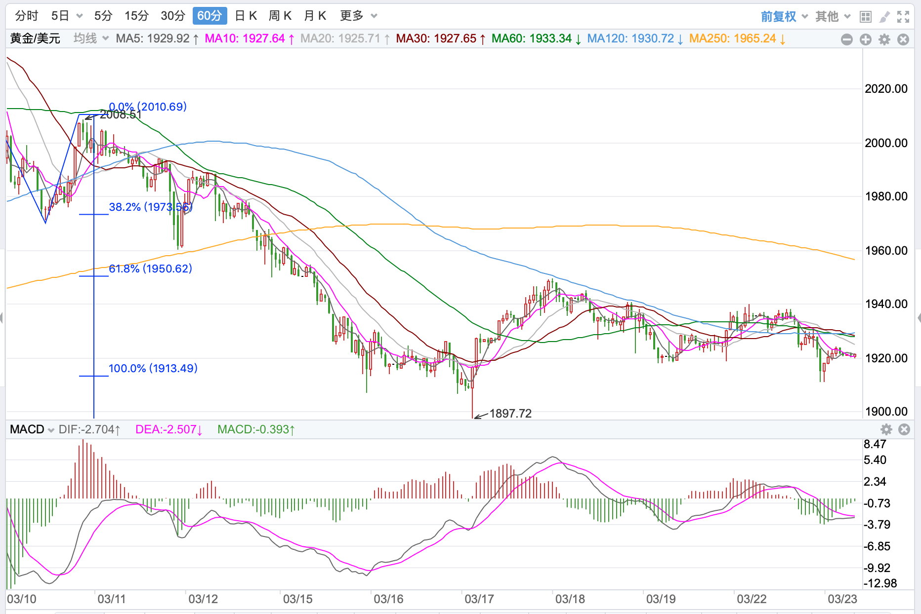 金价从1445美元/盎司的前期低点一路展开上行,创出之前2075的新高后,先回落后持续震荡下跌达到15个多月。当前整体价格在MA200上下运行,MACD指标弱势震荡,形成触底反弹的走势。近期短线1900美元是多头关键的支持,上方阻力1950美元。日内短线有震荡调整的趋势。