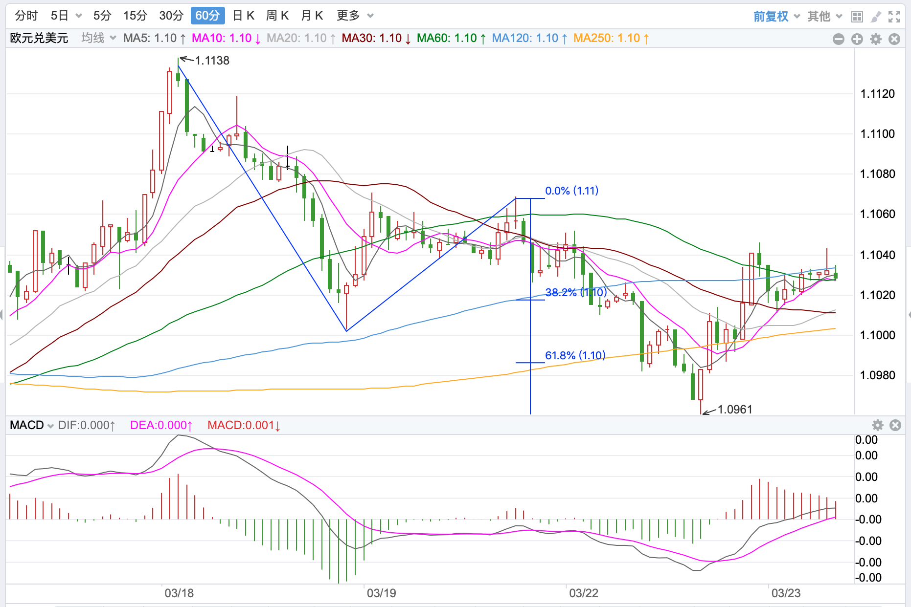 前期自2020年3月底企稳1.0635低点开启上涨走势;2021年1月触及1.23495点的高位后持续震荡下行。2021年11月跌破60周MA均线支持,中长期多空分水岭的支持跌破,行情处在回落调整的下行走势中。当前日内短线行情有反弹向上的趋势。