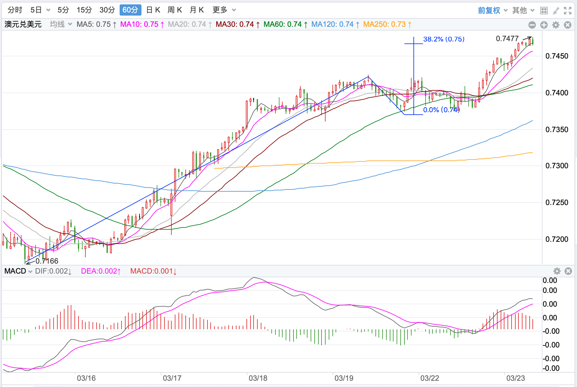 前期自2020年3月底企稳0.5673低点开启上涨走势;盘中突破了MA200均线的关键阻力而上行走高;2021年2月触及0.80072点高位后开始震荡走低,8月底企稳在0.7114点展开反弹走势再度终结,目前重回8月低点调整走势。当前日内短线继续上涨的趋势。