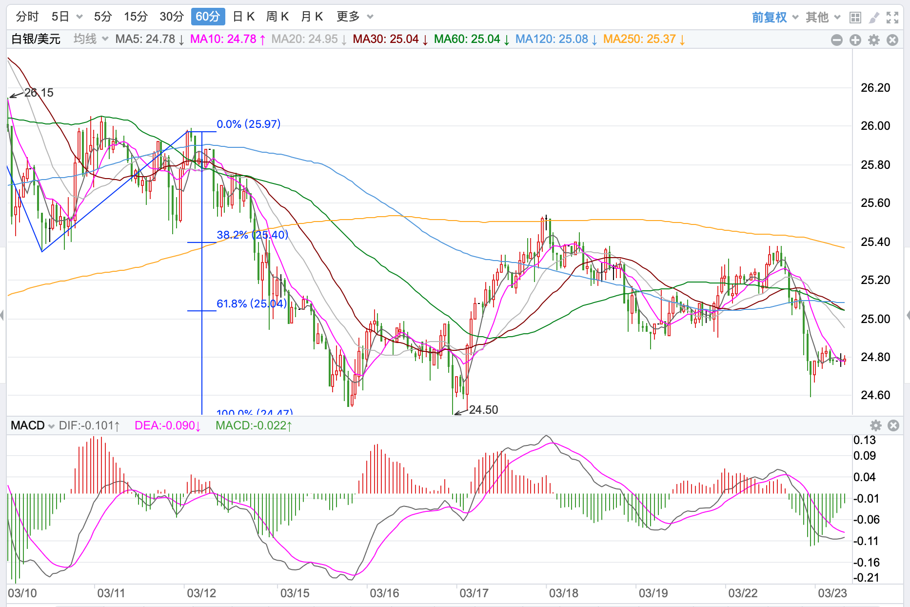 银价从19.64/盎司附近大幅下跌回落,创出五年来的新低到11.29美元附近,随后价格一路反弹上行,两次上涨达到30美元后展开回落。目前整体价格在MA200下方运行,MACD指标企稳弱势震荡,60均线突破企稳打开上行空间延续上涨。近期关键支持是24.0美元,上方关键阻力27美元附近;日内短线有震荡调整的趋势。