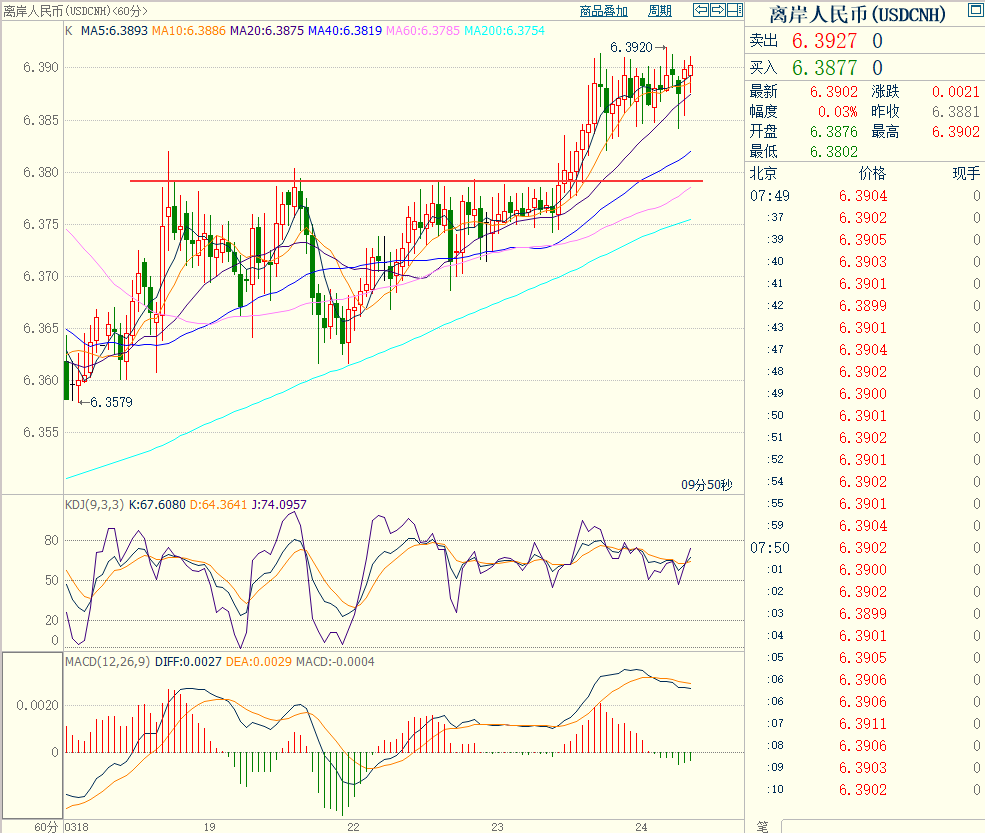 离岸价前期自2020年5月高位7.1964开启下跌走势,盘中跌破MA200均线的关键支持而下行走低;2021年5月触及6.3477点低位后开始震荡走高。2022年2月自6.3758开始回落走低,人民币相对美元继续升值,不过走势依然保持在6.3-6.4之间调整。当前行情日内回落向下的趋势。