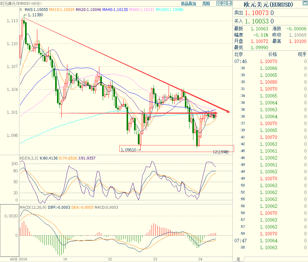 前期自2020年3月底企稳1.0635低点开启上涨走势;2021年1月触及1.23495点的高位后持续震荡下行。2021年11月跌破60周MA均线支持,中长期多空分水岭的支持跌破,行情处在回落调整的下行走势中。当前日内短线行情有反弹向上的趋势。