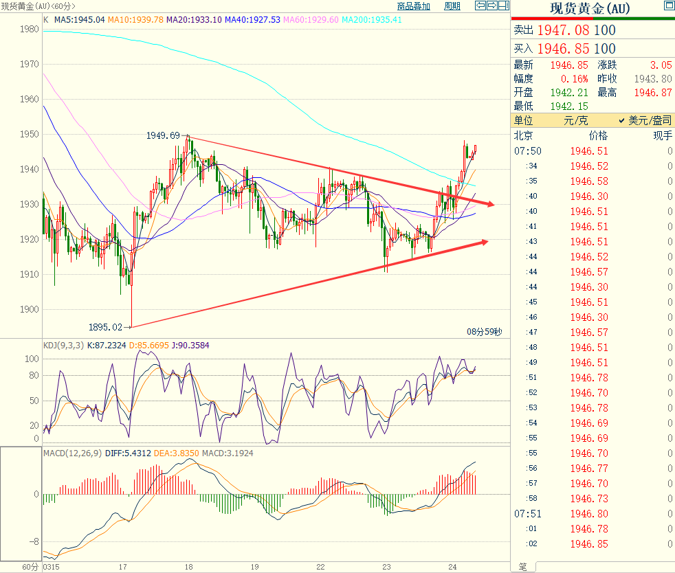 贵金属市场继续探底反弹,重回升势向上反弹的走势。黄金周三收盘冲高,收盘至1943.8美元/盎司(期货黄金周三夜盘收涨至398.62元/克,涨幅1.06%)。白银周三探底反弹上涨至25.14美元/盎司,涨幅达到1.37%(期货白银周三夜盘上涨收盘至5130元/千克,涨幅1.01%)。