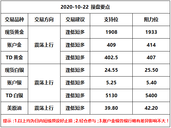 一、基本面分析 上个交易日黄金承压于1896美元展开回落收盘在1887美元/盎司,白银承压于24.82美元展开回落收盘在24.62美元;上个交易日中国黄金和山东黄金分别收盘在11.50和24.45元/股;美国原油上个交易日收盘在40.33美元/桶。影响因素分析看,首先,现货黄金反弹,因美股攀升导致美元再度疲软,分析师称,周五是回
