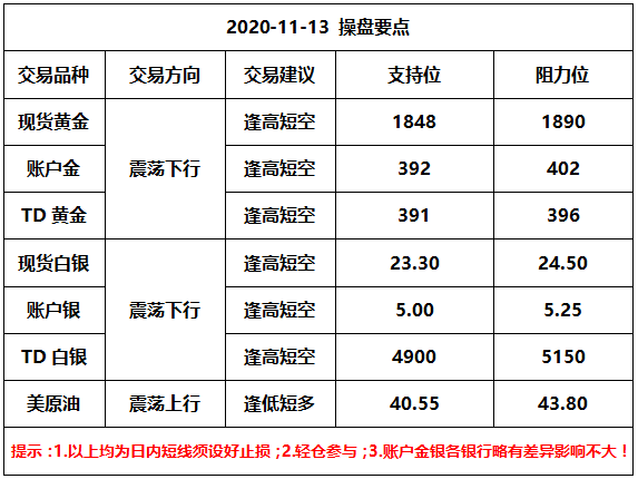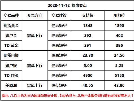 一、基本面分析 上个交易日黄金承压于1965美元展开回落收盘在1862美元/盎司,白银承压于26.01美元展开回落收盘在24.10美元;上个交易日中国黄金和山东黄金分别收盘在11.48和25.90元/股;美国原油上个交易日收盘在39.98美元/桶。影响因素分析看,首先,金价周一暴跌,因随着首个新冠疫苗后期试验成功的消息传出,可能