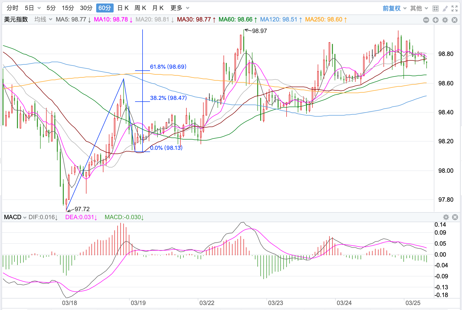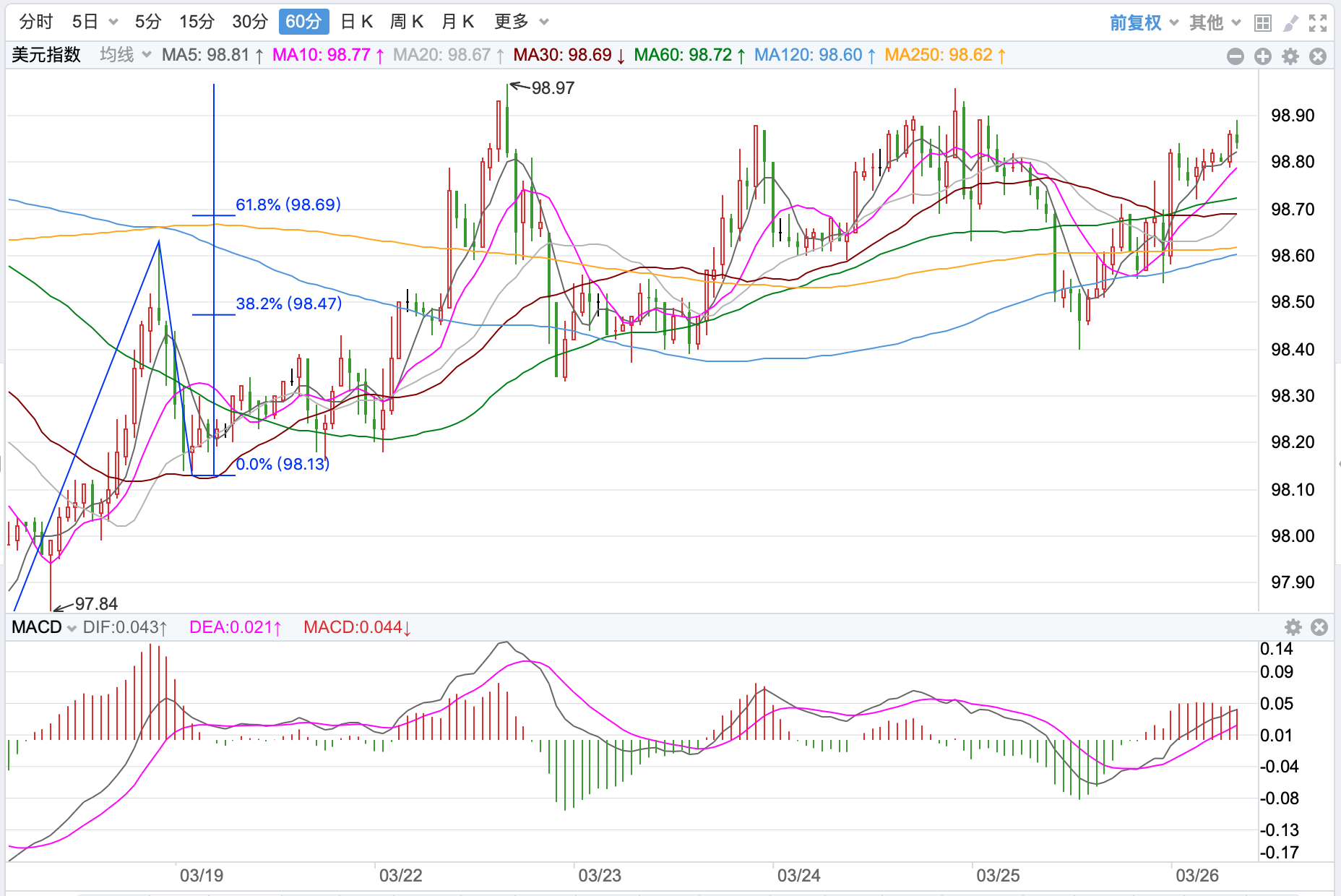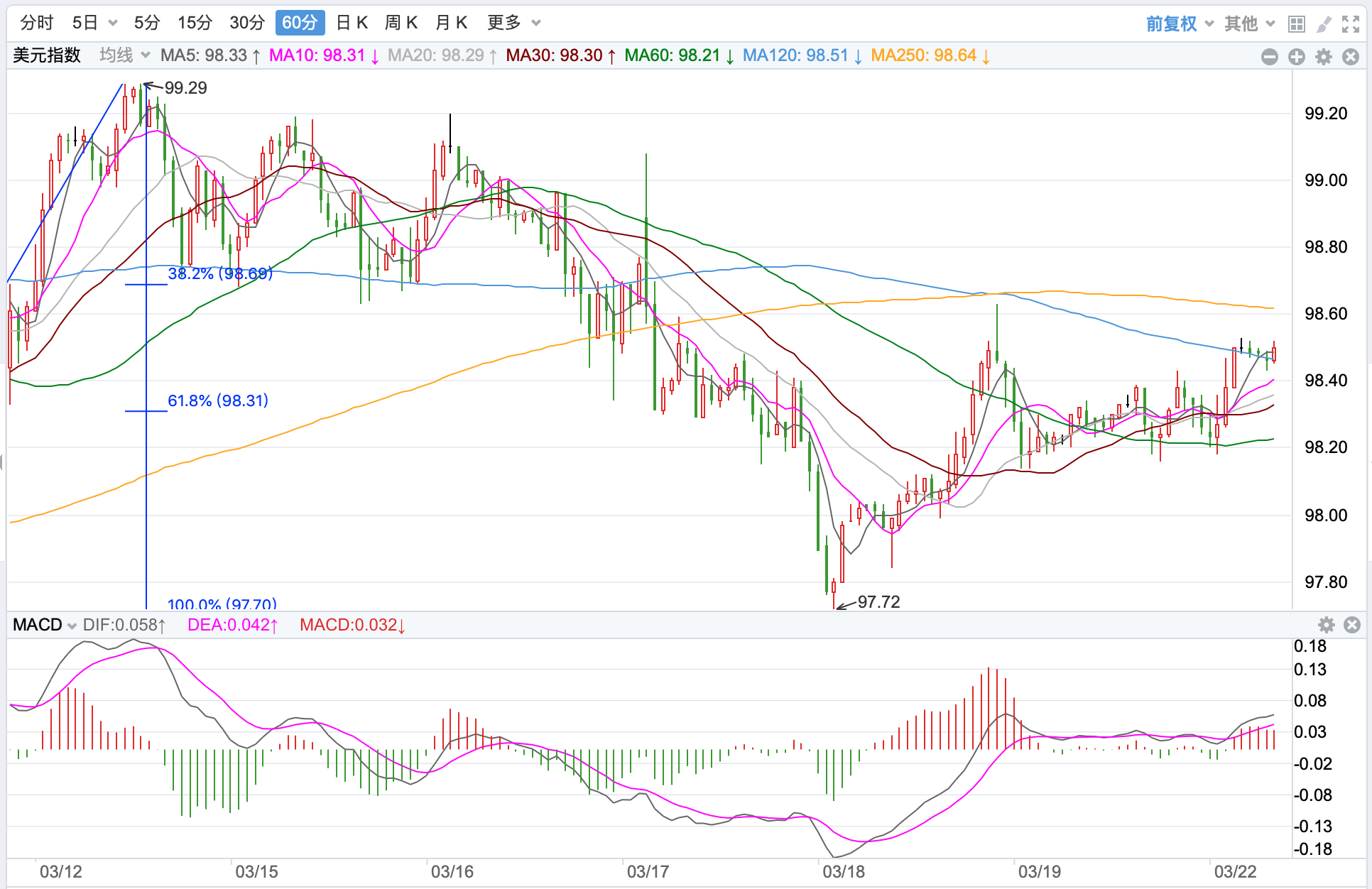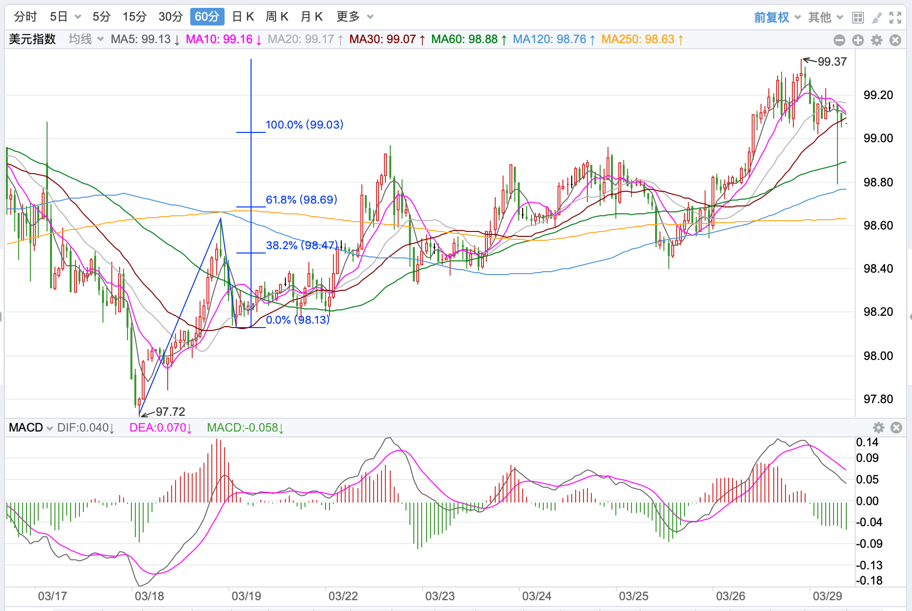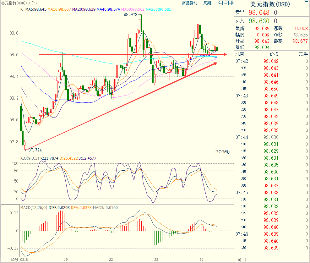 行情走势早报 北约峰会欧盟和七国峰会上周分别举行,会议达成的继续制裁俄罗斯、支持乌克兰和美油气出口欧洲等决议,恐怕无助于当前俄乌局势的缓解。外汇市场紧张气氛丝毫不减,美元上周五探底反弹收98.8点,涨幅达到0.01%,持续在高位运行。欧元冲高回落收跌至1.0988点,跌幅-0.09%。美元/日元探底反弹回升收高至1