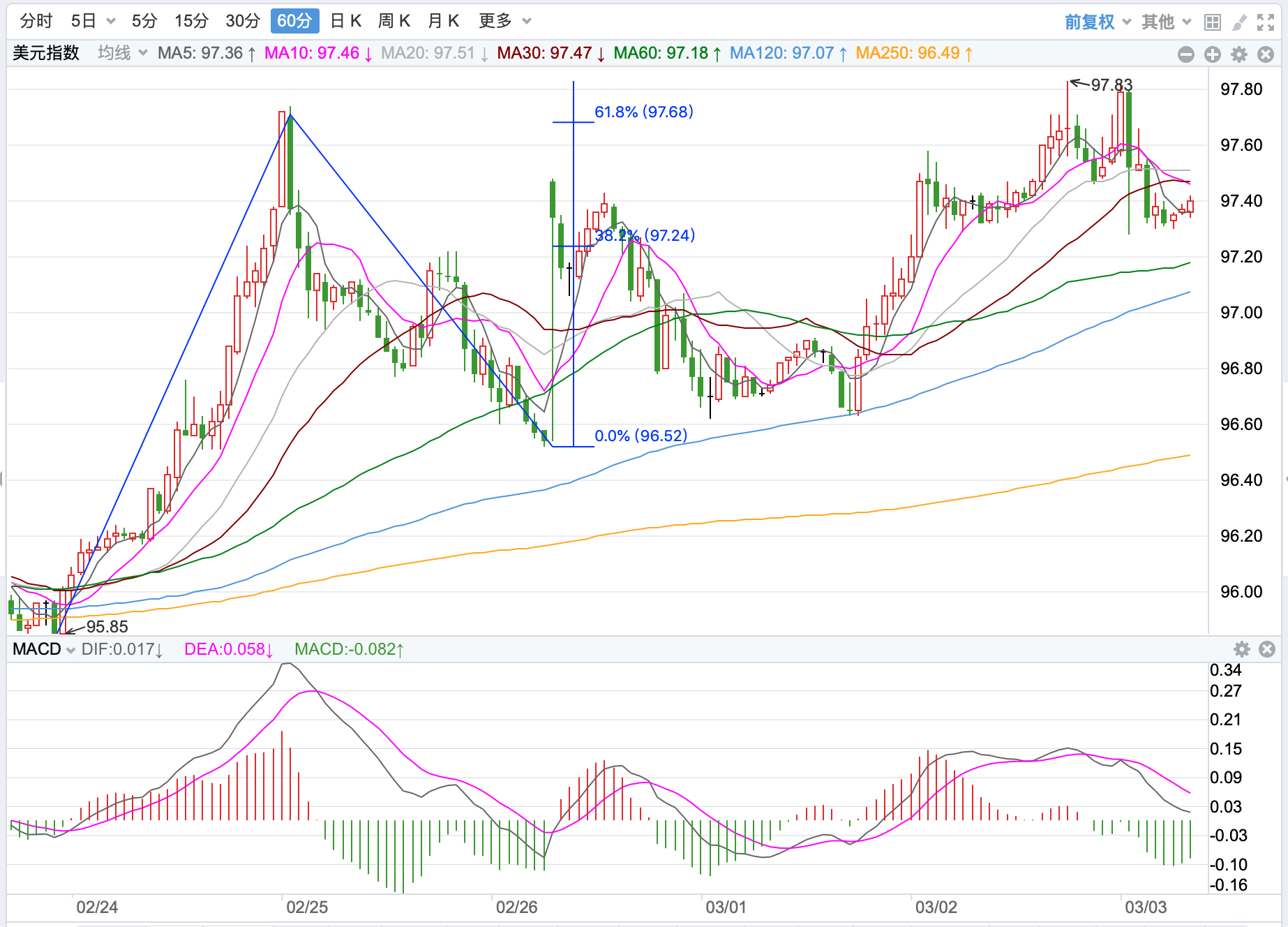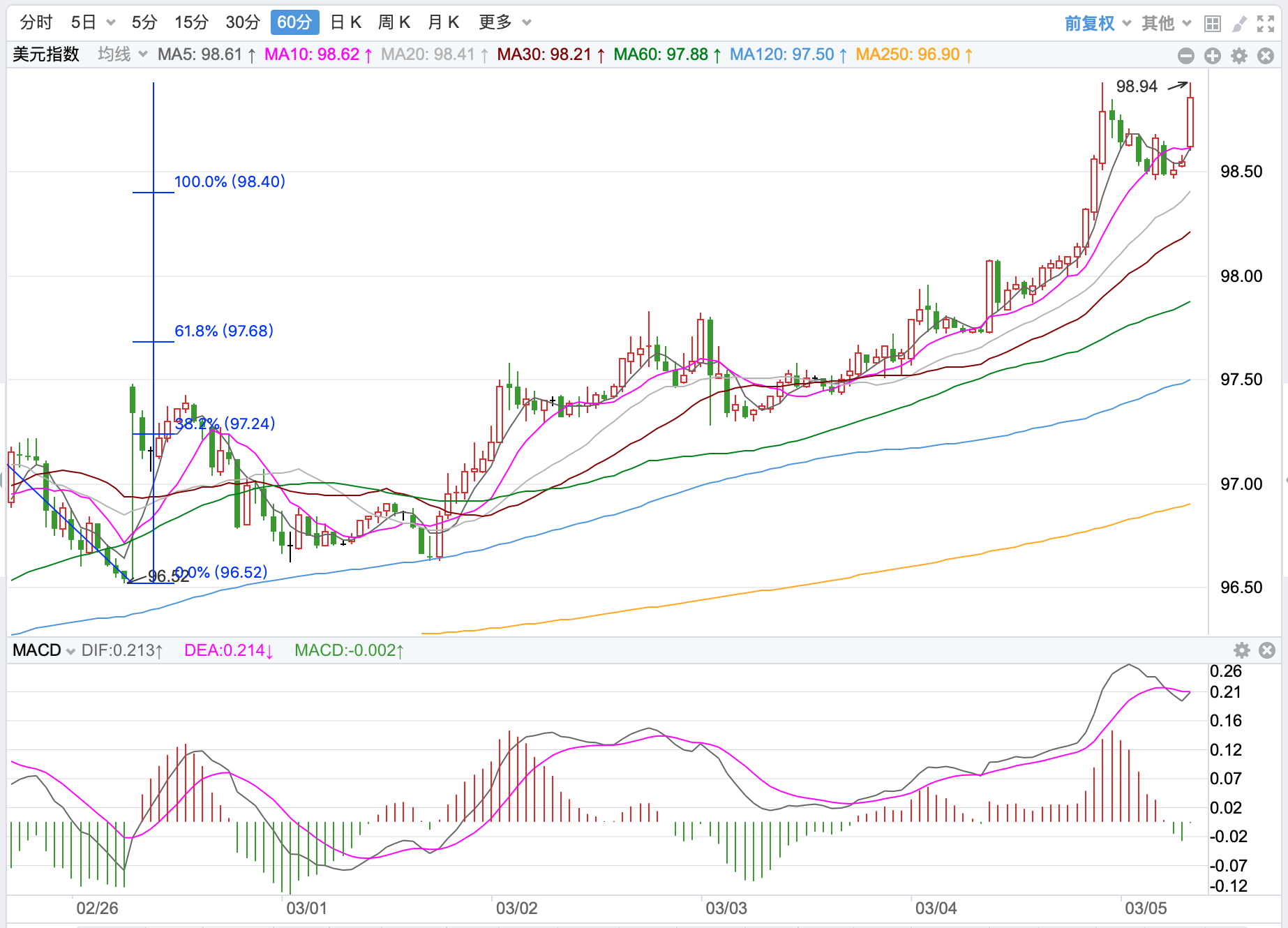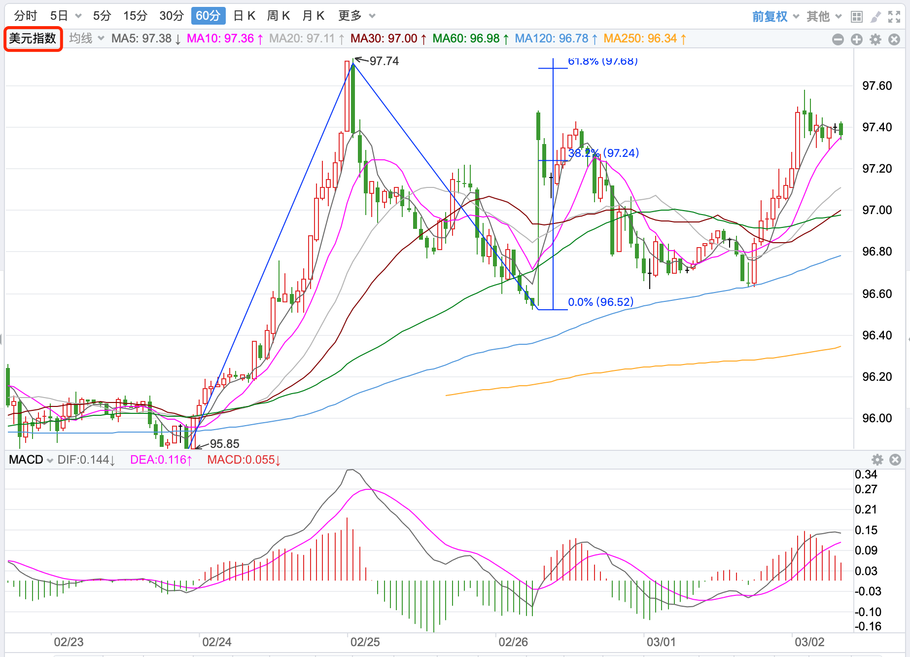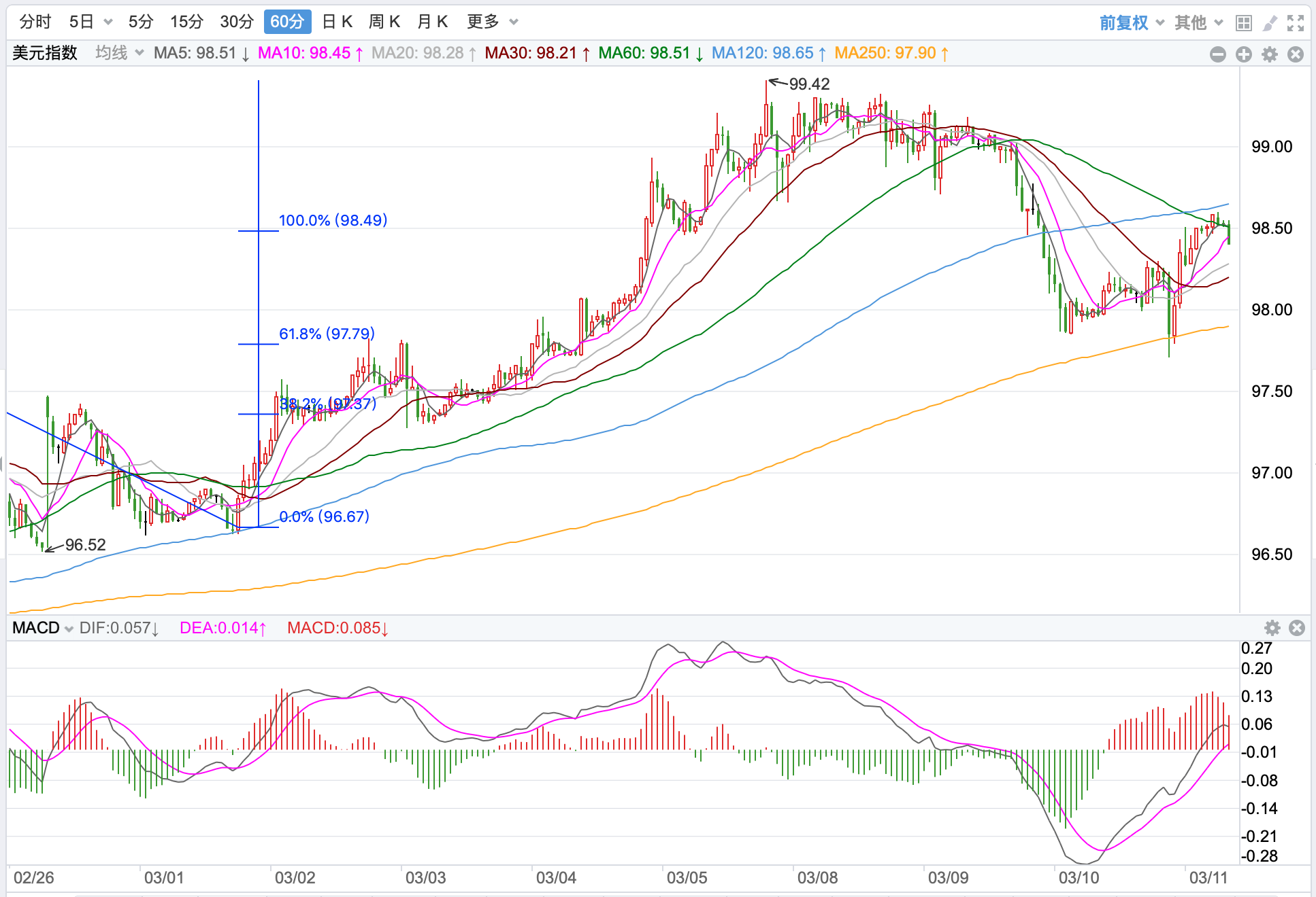 行情走势早报 第三轮俄乌谈判结束后,乌俄罗斯关于停火和停止敌对行动的磋商将继续进行,相关问题到目前仍没有实质性结果。美西方国家正在考虑扩展俄制裁至能源领域,虽然欧洲国家仍存在明显分歧,但已经引发投资者对于通胀超预期走高的恐慌。周一收盘美元继续大幅上涨最高触及99.4180点,尾盘回落收低在99.2530点