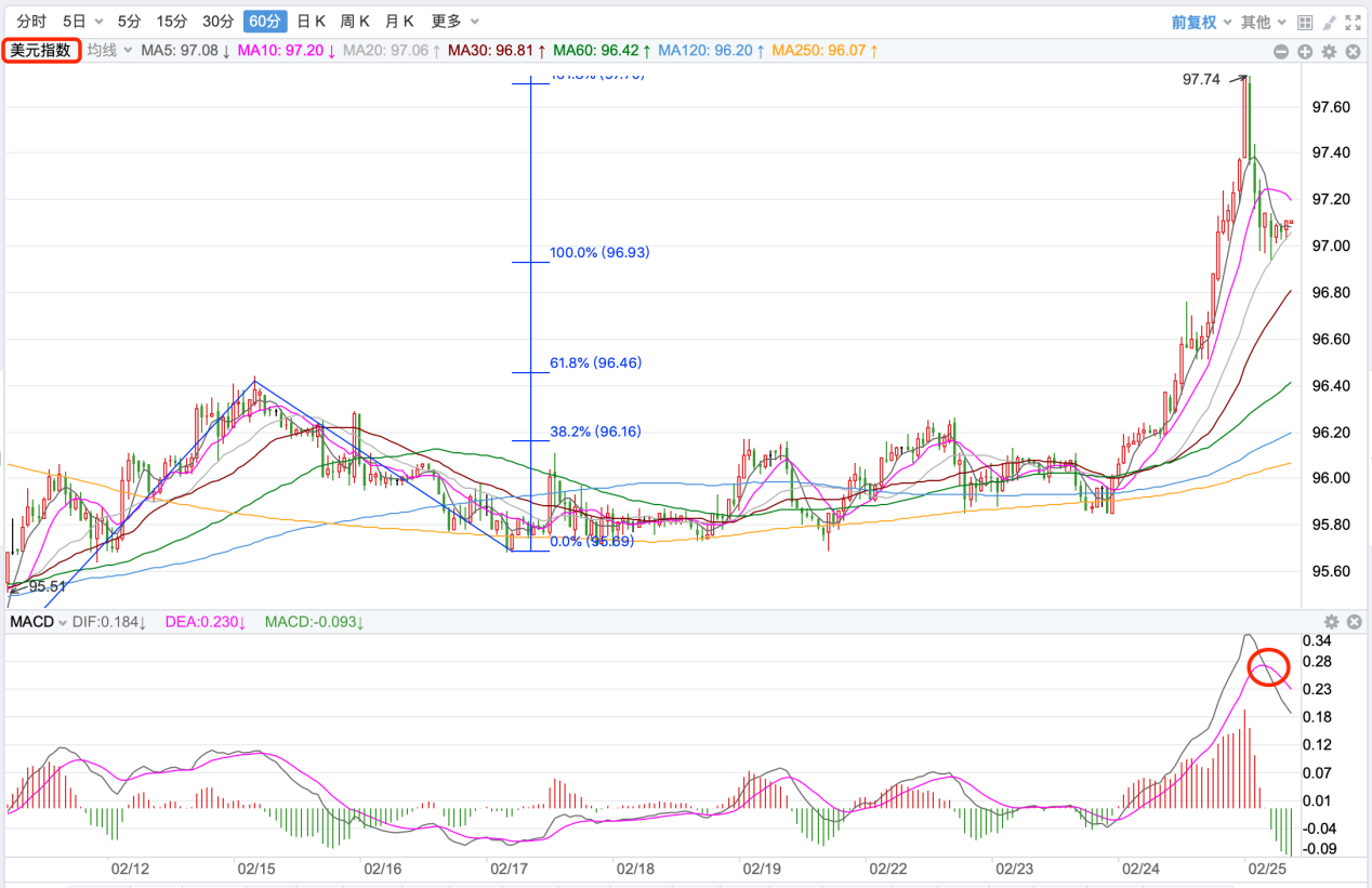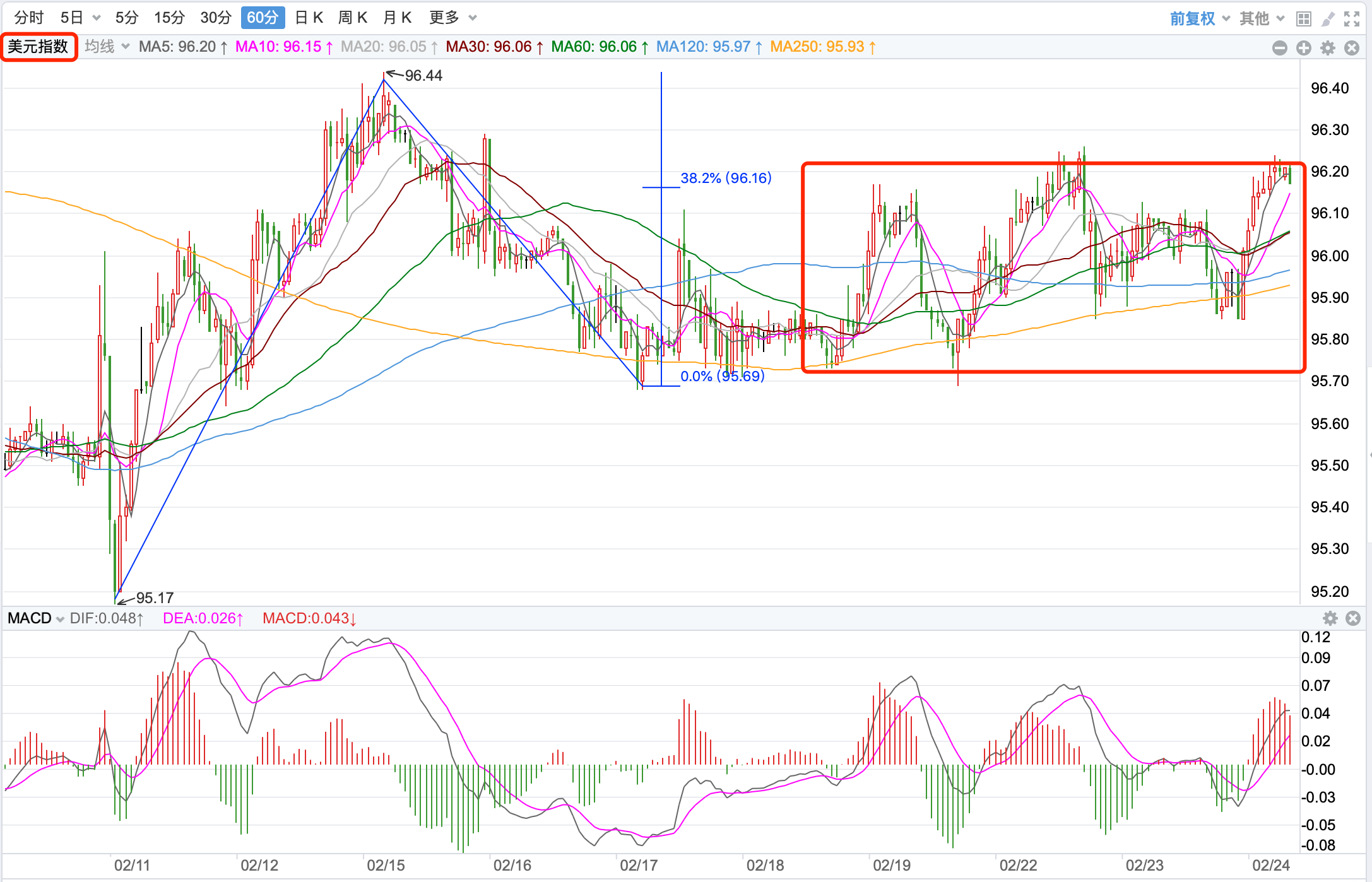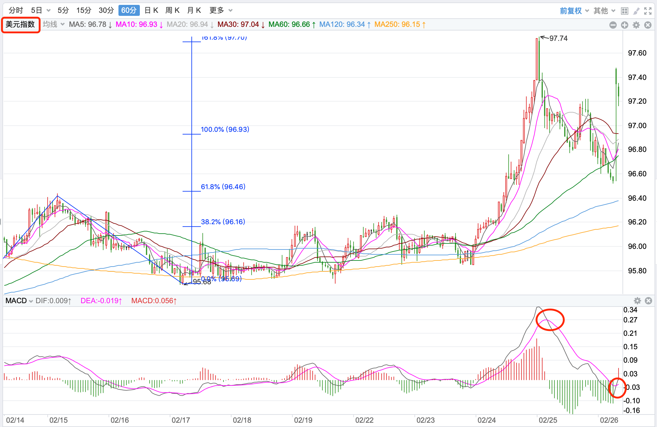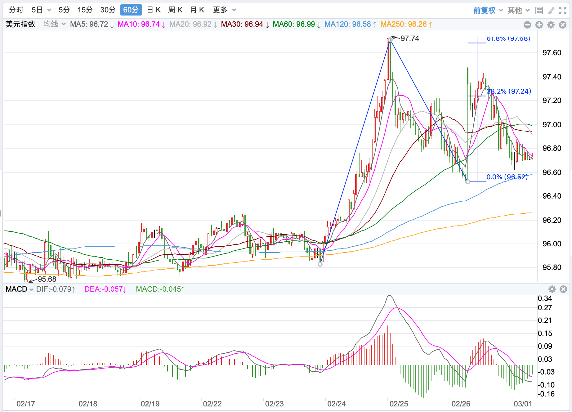 行情走势早报 第三轮俄乌谈判结束后,乌俄罗斯关于停火和停止敌对行动的磋商将继续进行,相关问题到目前仍没有实质性结果。美西方国家正在考虑扩展俄制裁至能源领域,虽然欧洲国家仍存在明显分歧,但已经引发投资者对于通胀超预期走高的恐慌。周一收盘美元继续大幅上涨最高触及99.4180点,尾盘回落收低在99.2530点