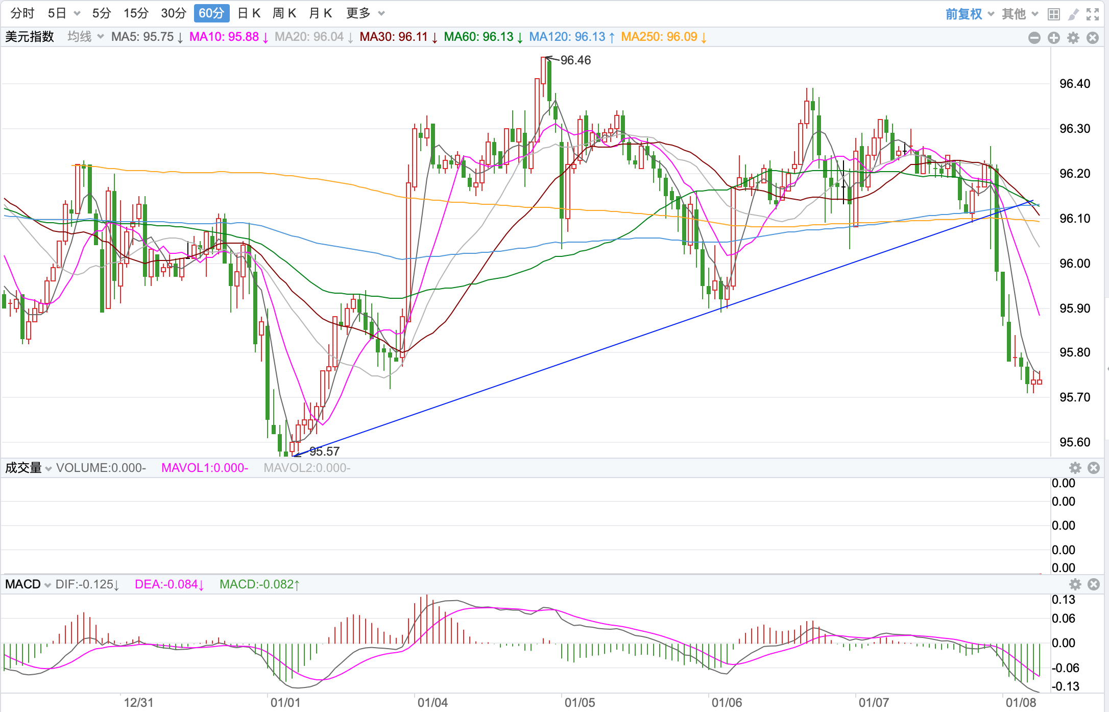 行情走势早报 外汇市场,美元周四冲高回落在此失守96点整数位,最终收盘至95.962点附近,涨为0.16%。欧元盘中回落调整走低,收盘在1.1326点,跌幅为-0.19%。美元/日元冲高回落,盘中收在115.055点,涨幅为0.08%。美元/加元继续回落走低,收在1.2739点,跌幅为-0.41%。英镑/美元探底反弹大幅上涨走势,收高在1.3503点