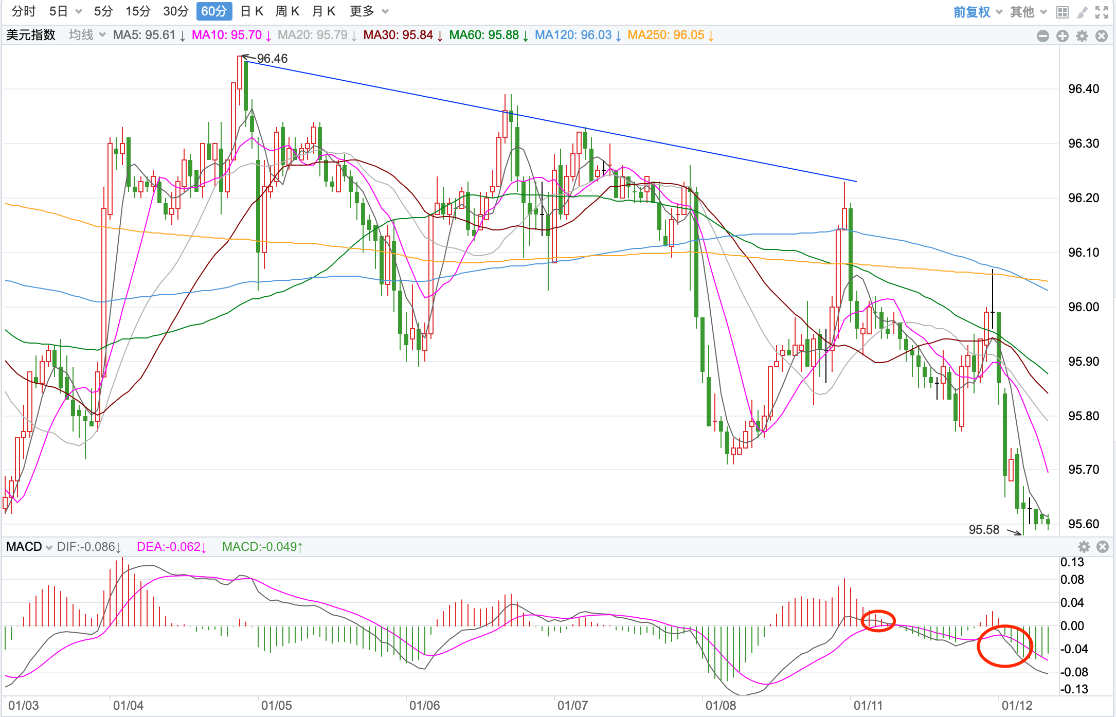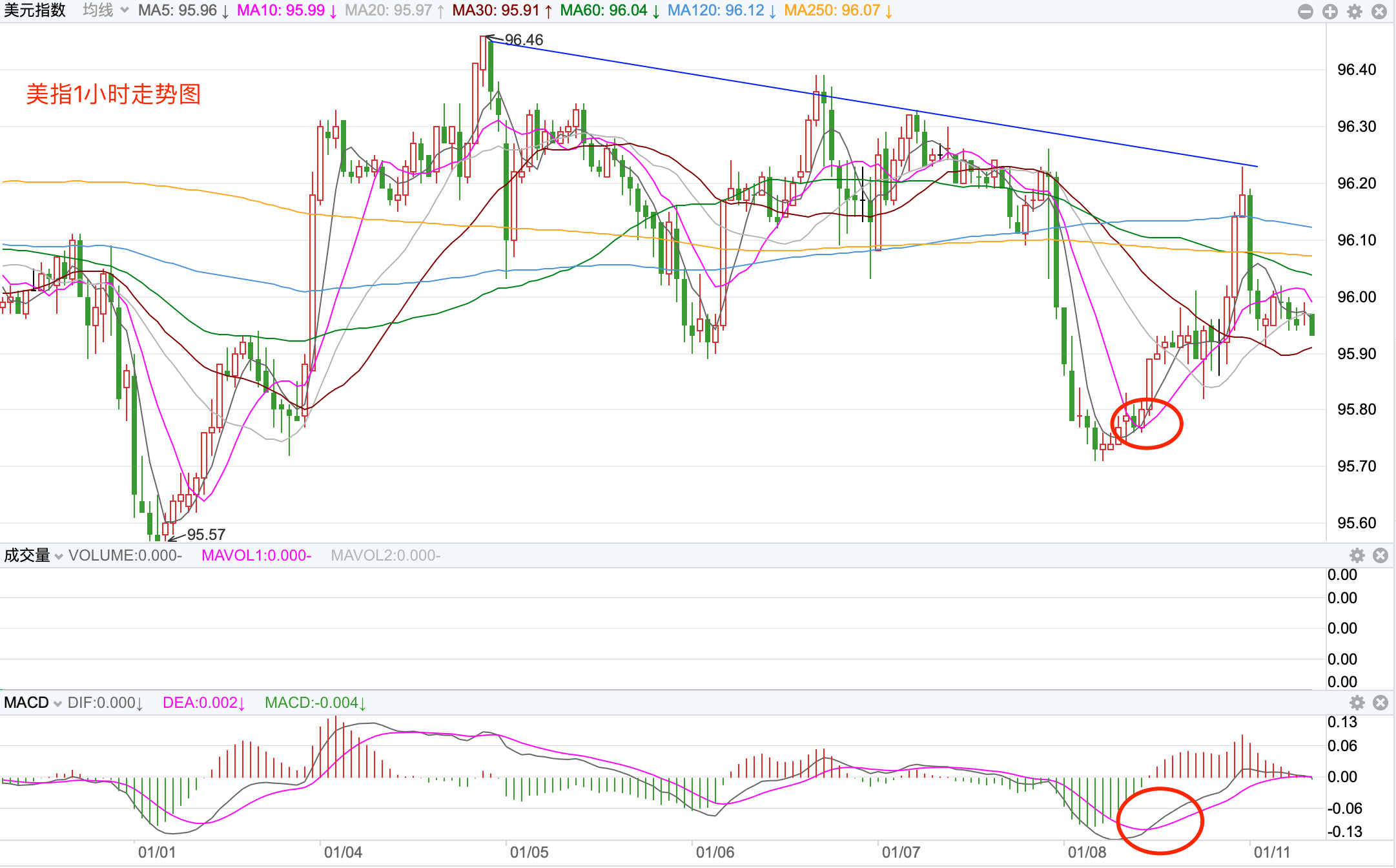 行情走势早报 外汇市场,周一美元探底反弹,再次重返96点的支持,最终收低至95.946点附近,涨幅为0.23%。欧元下行探底一度跌破1.13点,收盘在1.1326点,跌幅为0.02%。美元/日元继续下跌,继续回落收盘在115.205点,跌幅为-0.29%。美元/加元探底反弹,收在1.2677点,涨幅为0.27%。英镑/美元十字线调整走势,收盘在1.35