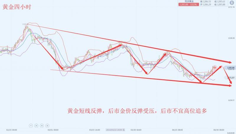 黄金短线四小时方面看来,金价经过上周强势上涨后,上方触及到1290一线的压制,日内早盘时段,金价短线回踩,中线上也是结束了黄金在第三浪反弹的走势,本周黄金将会开启第四浪的下行走势而且当前黄金虽然在短线上算是一个多头趋势占据了优势,但是中线上看来,黄金的高点在不断下压,而且后市金价自1346一线下行以来,进件中途虽然也有过反弹修正,但是依旧逃不过金价继续下行的走势,而且当前在四小时看来,金价上涨才结束第三浪下行的走势,短线反弹我们只能看着是黄金做第四浪下行做修正,并不能看着黄金能够继续反弹的走势,日内早盘时段,金价在高位明显感觉到有压制,而且加之近期美指一直走强,也是给黄金上涨给出不小的压制,综合来看,金价在中线方面并未结束下行走势,而是在做第四浪下行做准备而已,这样看来,黄金在日内还是建议高位做空为主,上方重点关注1290一线的压制,破位关注千三多空分水岭。