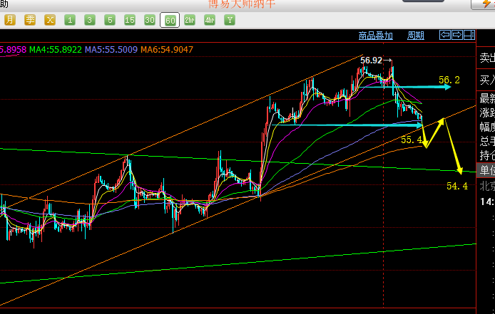 昨日符合周末的判断,提示57及上方随时会中空打压下行,结束近期这轮的反弹,从大周期看,原油始终保持空头趋势运行,日线经过连阳上涨后,昨日高点56.8毕竟强压点,也毕竟日线下降趋势阻力线,最终压制迎来一波不错的下跌,收报大阴压制,惋惜的是差一些未给到中空计划点,今日关注55.4,不仅是前期突破上攻后最后一次回测支撑点,也是趋势线通道下轨,这里一旦失守恐奔向54.4下一个支撑点,建议反弹空为主,做空点关注56.2下逢高参与,此位置是隔夜下破后走弱的转换点,或者日内无法触及,欧盘持续走弱慢跌,美盘前后反抽一波诱多后择机干空,和昨晚一致;