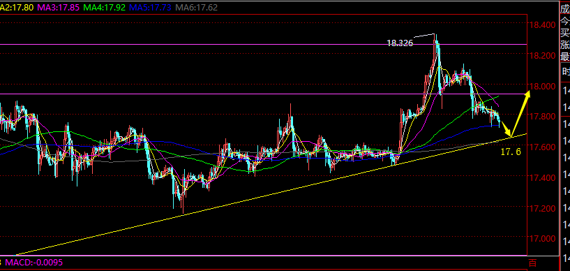 昨日也迎来一波下跌,这几日主力洗盘力度较大,上周基本保持偏强震荡拉升,一度冲击18.35一线,随后上周五冲高下跌,昨日延续下行,回归到了17.7,短线变化速度还是相对快;今日关注17.6趋势支撑,逢低参与多,不认为降息之前价格会跌太多,宽幅的洗盘依旧会进行,一旦企稳短线上攻,还是容易回到18美元上方,会选择多观望,耐心等出现快速拉升企稳信号再去介入低多,直到周三夜间后再择机布局波段做空;