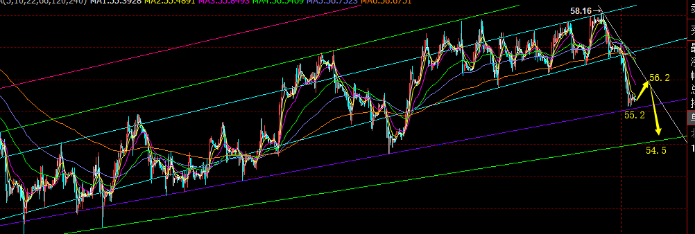 本周这两天原油迎来了持续性的单边下跌,结束了前两周以来58-56区间内的反复有规律的震荡走法,昨日依托震荡下轨56.6逢低安排的多单失败告终,既然方向开始明确,选择破位下跌,就要接受事实,及时改变思路,今日以昨日跌幅反抽的50%分割压力56.2作为做空点,其下看空,并且此位置也属于58.2、57.2所连接的趋势压制衍生点,下方先关注55.2,这里是具备一定趋势支撑,但对于隔夜弱势下跌无反抽看,暂时不计划这里低多,因为凌晨最后横盘的压力在55.6-55.5,空间并不大,只有欧盘突破亚盘高点后,才能反弹测试56.2做空点,也不急于55.6低位去博欧盘的破位延续,下方首次见到54.5是可以低多一次的,此位置属于51上涨至58.2后回测的50%分割点,同时也属于前期顶底转换点,触及这支撑后可以反抽回到55.2的上方;因此,日内保守稳健的则是56.2下空,或54.5上多,拉开距离去震荡操作,不能因为两天的跌,就急于认为空头趋势来了,虽结束了58-56小区间的反复整理,但大区间51上方的整理还是进行中;