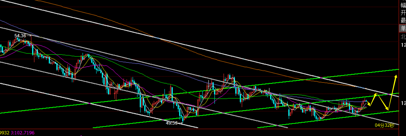 这几天原油处于底部52下方一直整理,而49上方也会多次支撑反抽,不断来回穿梭,往上突破新高不延续,往下破位新低同样无法延续,不过每天循环的规律还是明显的:早间亚盘基本都是先拉升一波,随后午后横盘后,欧盘进一步上涨,只是力度不大,美盘基本是打压下行;昨日文章指出49.7逢低多,到半夜收盘前才给到此位置,思路方向没错,无非就是耗时间;今日有一个重要的技术点需要提出:前期从65.65高点打压开始单边下跌以来,一直受到65.65、59.9、52.2所连接的趋势压制线,但昨日刺破回落后,今日明显算突破上行了,这意味着原油极有可能开启一波反弹修正,当然,目前上方有两个压力得突破,一个是日线10日均线51.3-51.5,一个是底部盘整的最后一次压制点52.2,这两个位置以此突破,后市可以修正指向前面所讲的月线回补通道点55-55.5位置;因此操作上,要开始保持相对低多为主去运行,而靠近51.3-51.5、52.2两个压力再去尝试高空,一旦52.2突破,就可以尝试波段持多,后市抵达55.5下再去波段干空,大方向空头还不变,短期方向面临一定修正;