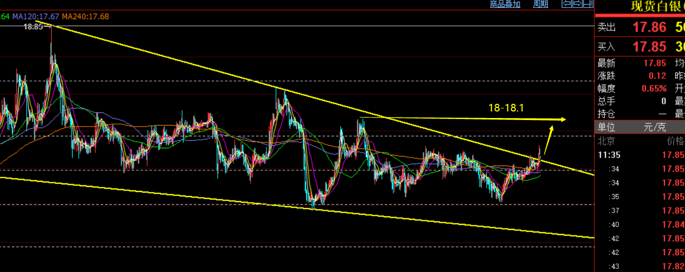 白银近期以17.5、17.58作为支撑点,提示波段看涨思路,今日早间抵达了17.85,并且突破了如图趋势关键压制线,那么意味着本周还进行延续上涨,走势上比黄金开始有所增强,预计指向18-18.1问题不大,继续波段看涨,持有多单即可;
