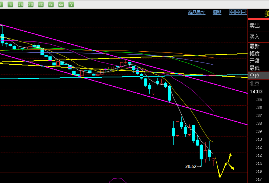 上周四周五连续连续经历了急速的上拉再大幅回落的洗盘过程,入场点不佳基本难逃被损局面,不过连续两周以来黄金不断的杀跌破底,短期价格走势依旧偏弱,并未见底,本周面临至关重要的拐点选择;下面来详细解读下:第一,周线级别,上周连阴收报,且收盘于趋势通道线下方,那么本周走弱延续还是一个比较大的概率,下方支撑关注1430分割位置;第二,日线级别近期连阴下滑,即便出阳也都是单阳模式,这也是短期空头的表现,周五虽反弹,但收盘价处于通道线下方,不足以改变弱势下滑局面,按照月线参考08年走势,价格刺破中轨逼近1400-1380才会崛起后市多头,而1400一线也是日线级别下方趋势线聚焦的强支撑点,预计靠近此处将是计划长线做多的最佳点位;第三,小时线走势,杀跌的高点在不断下移,从1703至1645至1598至1576至1553至1516,而目前考验的位置是1508,也是早间高点,近期低点支撑集中1470、1460、1450,而1450是命脉,破位的话就有可能指向1430,乃至1400;第四,几次杀跌以及几次急拉都和美股脱不了关系,重点关注美股走势,它一旦继续下滑走弱,则会引发黄金再一次的抛售,而想要避险属性刺激拉升,它的前期应该是美股稳定的情况下才会发生,当前美股已经即将再次破位近期低点,谨慎黄金的再次跳水打压;操作上,以1508作为压力,波段方向看跌,支撑1478-1474,破位则指向1465-1450底部区域;突破1508站上了,再去转变思路,回测跟多看避险拉升反弹;